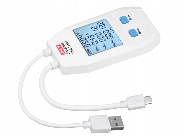 Чотирьохрядковий РК-дисплей відображає поточні значення напруги (В), струму (А), енергії, що передається на живлене обладнання (мАг) і час зарядки. Кнопка MODE дозволяє відображати напругу шини даних та еквівалентний опір підключеного пристрою. Вимірювання відображаються з роздільною здатністю до 0,01 В/0,01 А/1 мА/год/0,001 Вт-год/1 с/0,1 Ом. Лічильник має пам'ять на 10 вимірювань (запис і зчитування кнопкою READ).