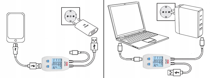 Пропонований лічильник є багатофункціональним пристроєм для моніторингу портів USB типу A і C під час заряджання підключеного смартфона, планшета, ноутбука тощо. Лічильник вимірює напругу та струм зарядки, шину даних напруга, споживана енергія, час заряджання та еквівалентний опір підключеного пристрою. Лічильник підключається послідовно до джерела живлення, кабель лічильника під’єднується до джерела живлення/зарядного пристрою, а смартфон/планшет/ноутбук під’єднується кабелем USB/C до роз’єму лічильника: