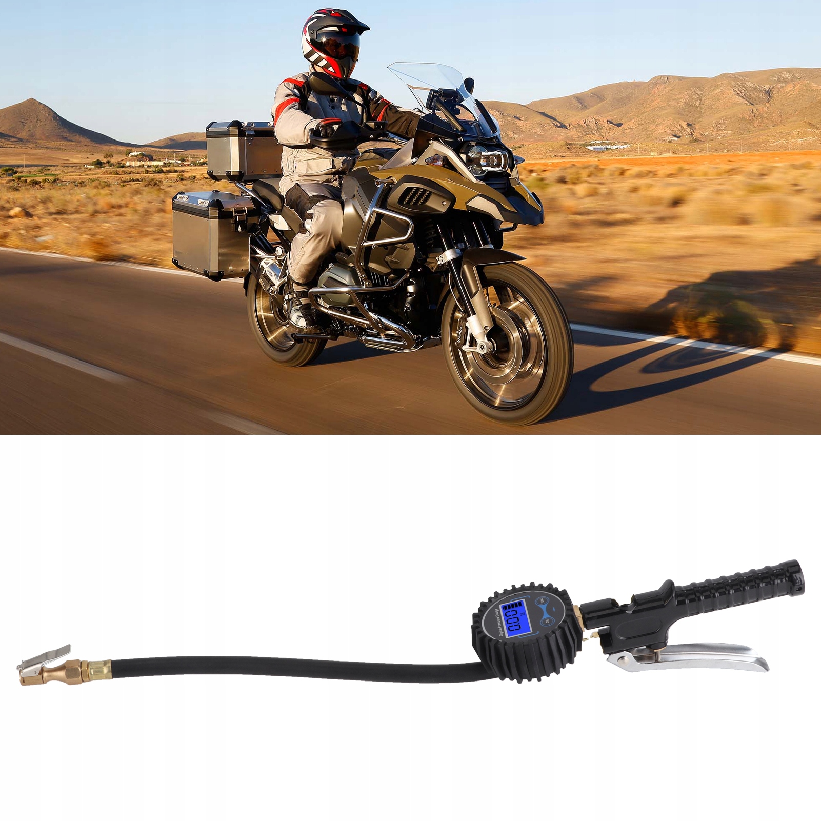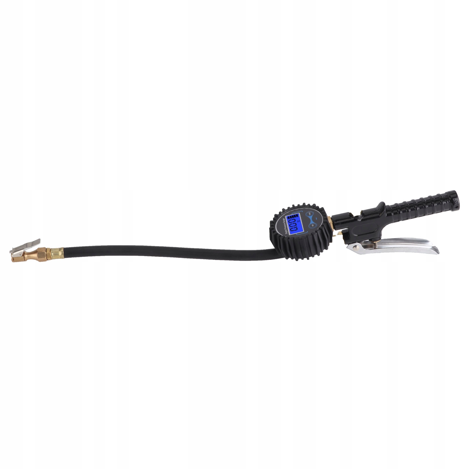 1. Відкрутіть клапан шин. Зафіксуйте мідну головку інструменту до клапана. Пристрій відображатиме тиск. Потрібно знайти повітряний насос і повітряну трубку для підключення повітряної насадки, і утримувати ручку продукту, щоб надути його через надношування, коли тиск низький, і навпаки. Після вимірювання під головкою міді та натисніть кнопку вентиляції, щоб індикатор змінився на 0.
