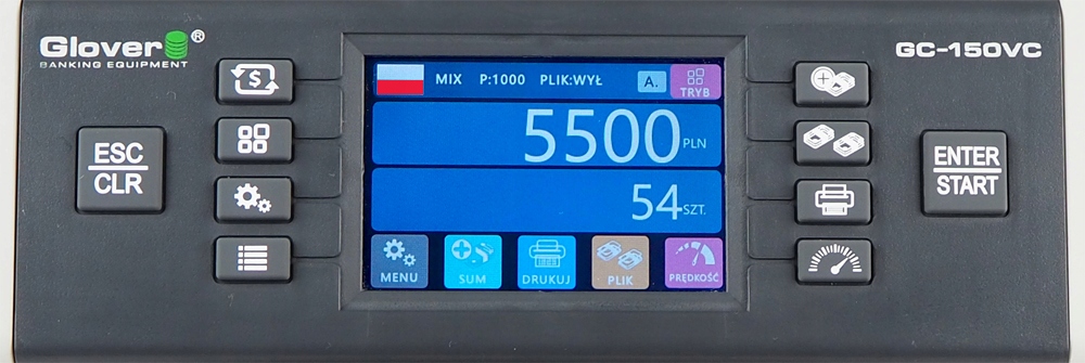 Лічильник Glover GC-150 VC є одним із найсучасніших приладів такого типу на ринку. GC-150 VC — лічильник цінностей з 1 відсіком, оснащений подвійним сканером банкнот (CIS). Він підтримує до 20 валют, включаючи PLN, EURO, USD, GBP, CHF, ... Оснащений передовою технологією для автоматичного розпізнавання валюти та номіналу. Лічильник дозволяє багатосторонньо виявляти підроблені банкноти (CIS, IR, UV, MG, MT). На лічильнику використовується 3,5-дюймовий сенсорний РК-дисплей, який дозволяє легко та швидко оперувати великими сумами готівки.