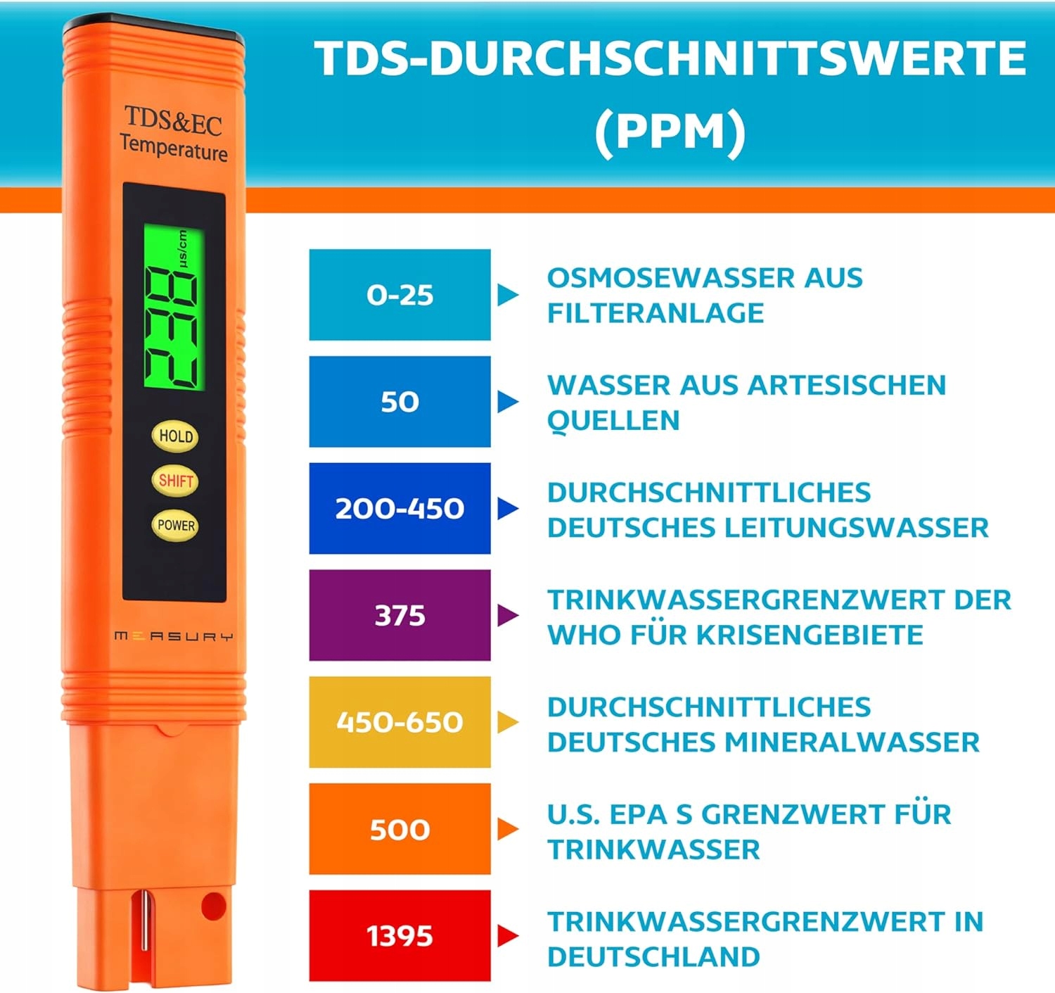 - Точні вимірювання: вимірювач MEASURY TDS&EC вимірює електропровідність (EC) у діапазоні 0–9990 мкс/см і значення TDS. в діапазоні 0 - 9990 ppm. Роздільна здатність: 1 мкс/ppm від 0 до 999, 10 мкс/ppm від 1000 до 9990. Точність вимірювального пристрою становить ± 2%.