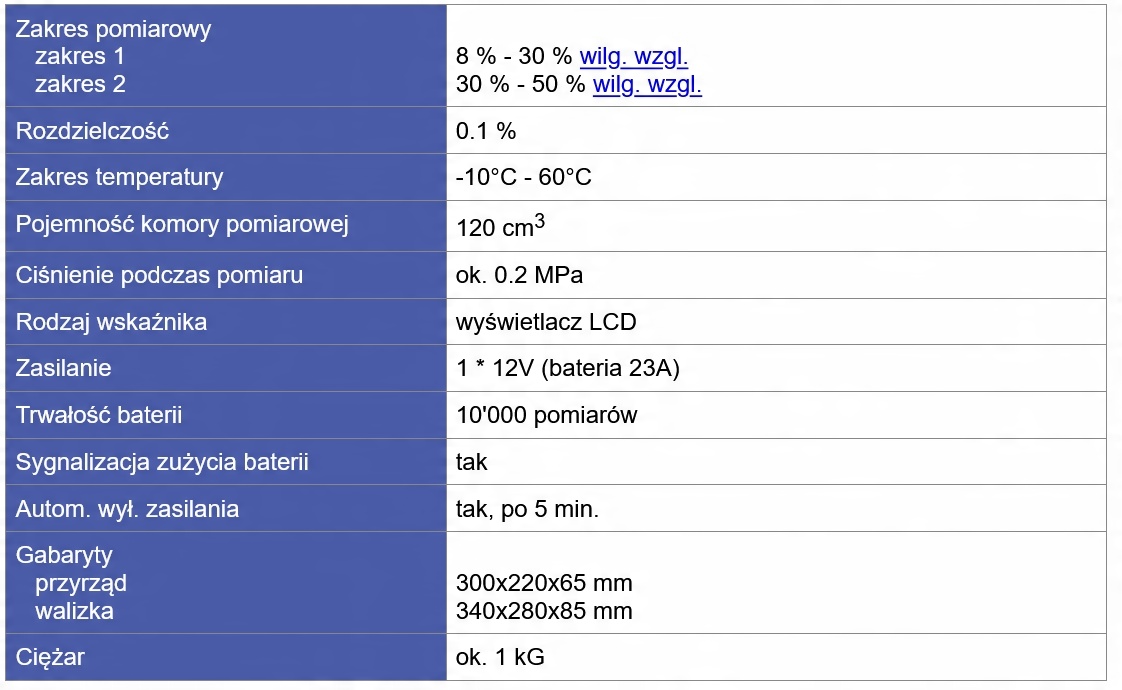 4 Основною метою пристрою є оцінка вологи матеріалів у виробничому процесі гранул та брикетів. Пристрій також може бути використаний для вимірювання приблизної вологості готових гранул (після подрібнення) та дуже вологої пилки. WKT-1E постачається в естетичній чорній валізі. Вимірювання проводиться на двох етапах: