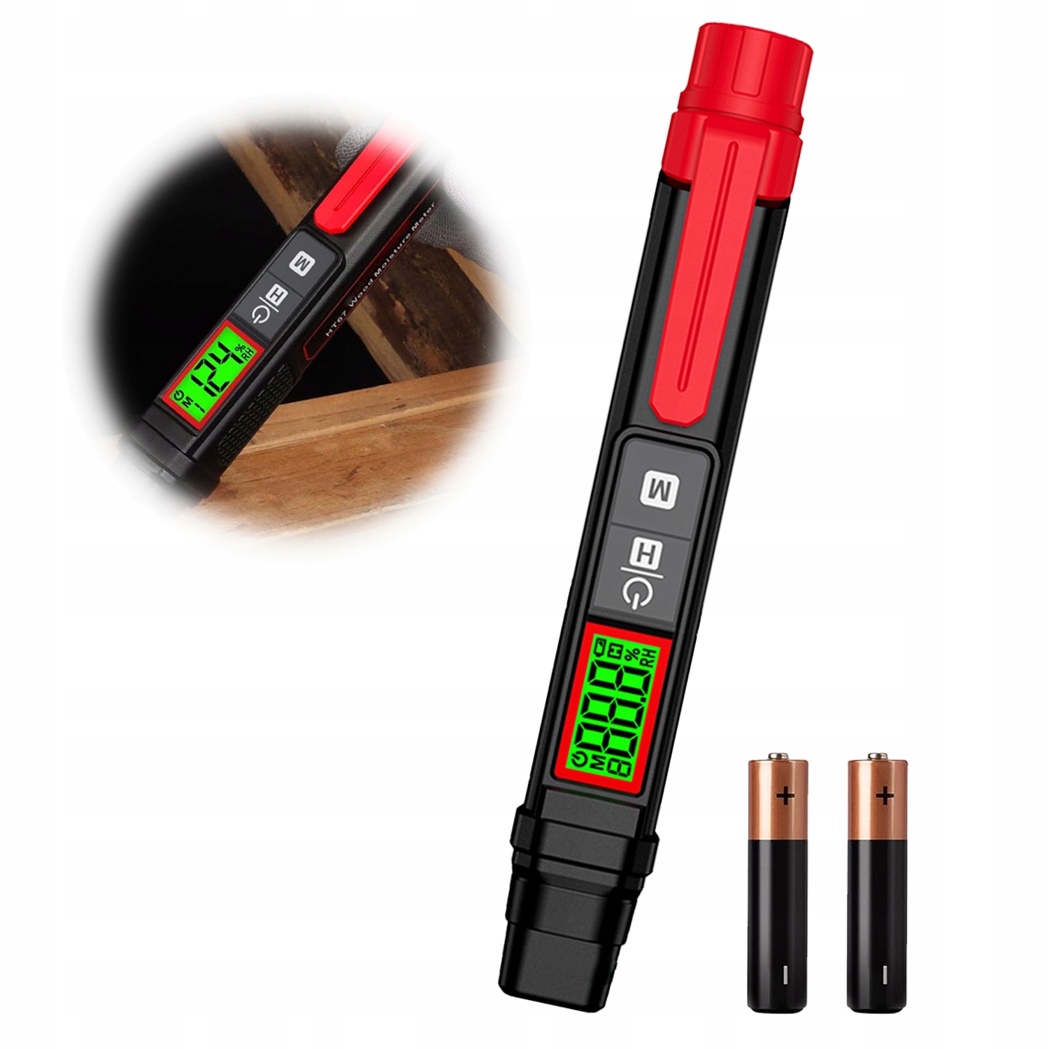 HABOTEST HT67 Дерев’яний вимірювач вологості, портативний метр вологості стіни з 7 калібрувальними лусочками, 3-кольоровим РК-дисплеєм, вимірювачем вологи у формі деревини, нагрівання деревини, стін та будівельних матеріалів (червоно-білого)