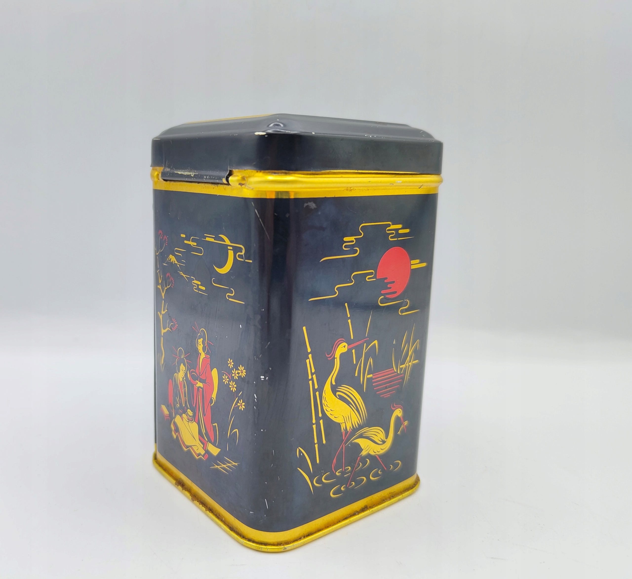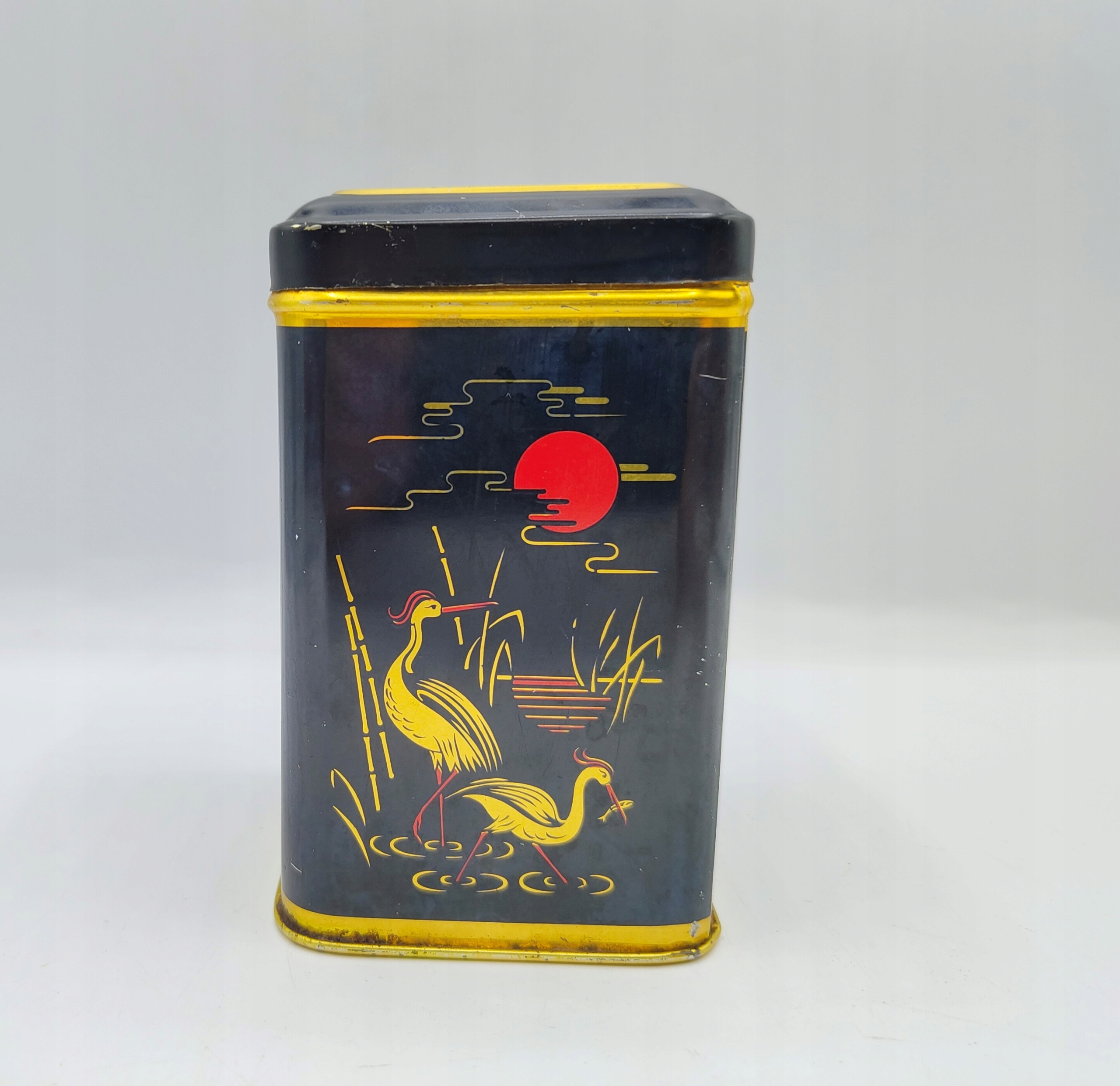 śliczna STARA puszka, kwiat wiśni, gejsze i czaple