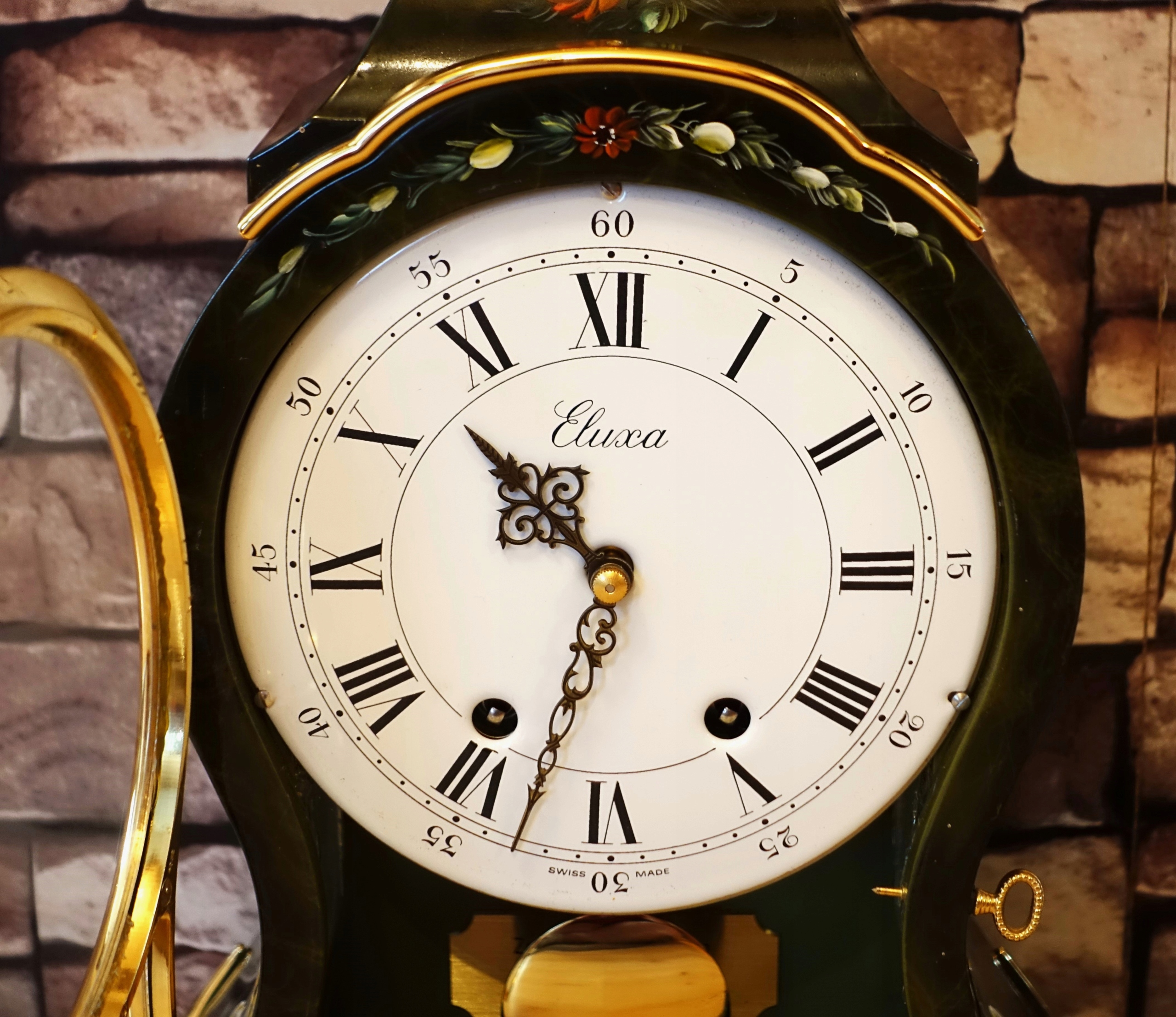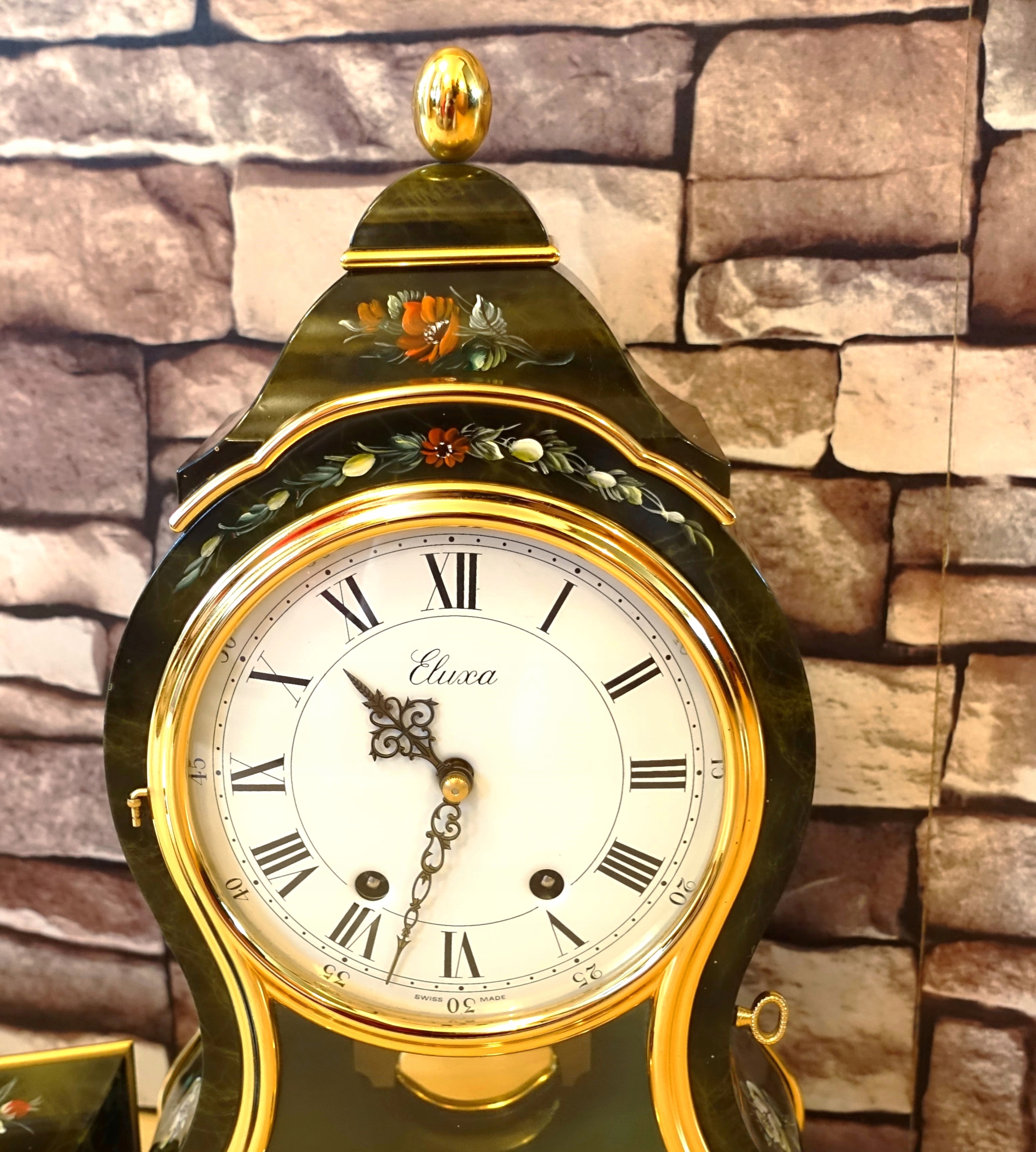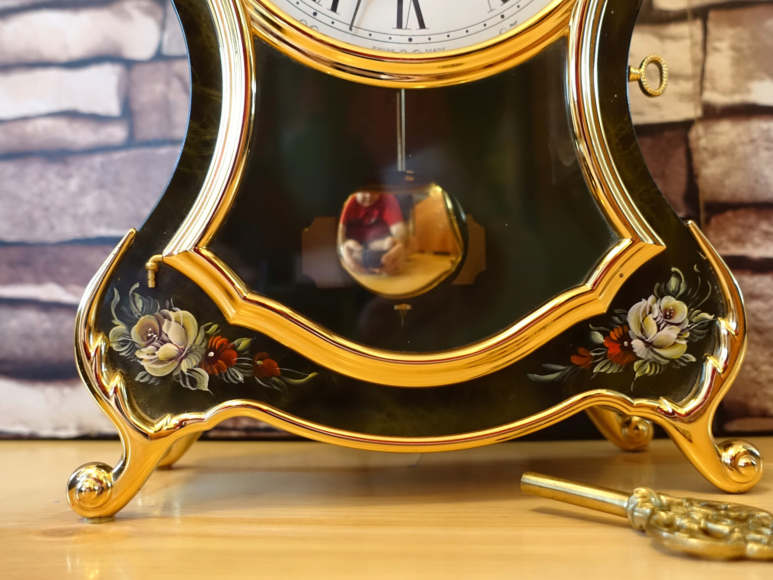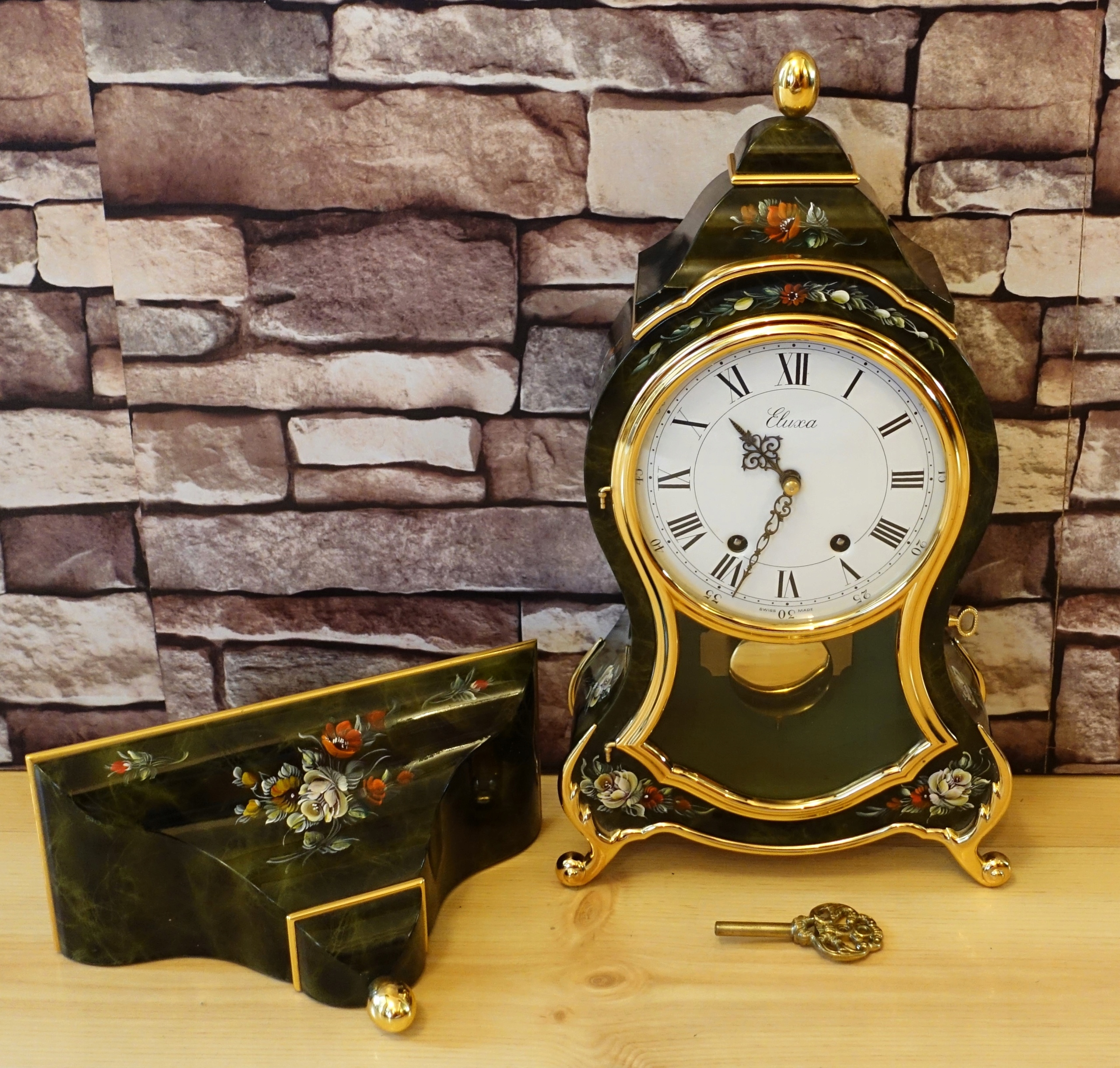 Годинник має гарний, багато прикрашений корпус з консоллю, прикрашеною ручним розписаним квітковим орнаментом. корпус без дефектів та інших пошкоджень б'є повний годинник і молотком.