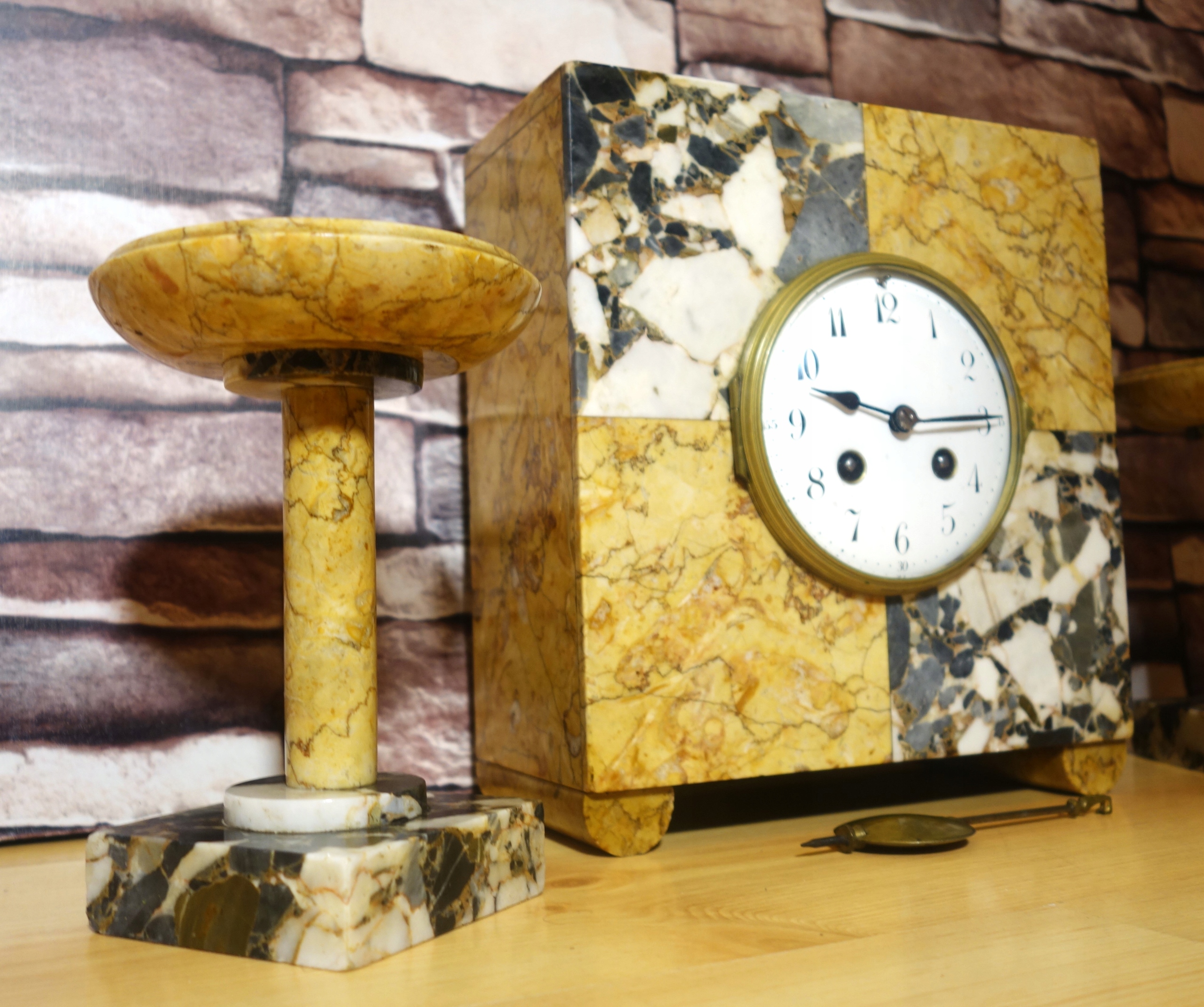 Годинник дуже декоративний, поєднання різних типів і кольорів полірованого мармуру дає дивовижний візуальний ефект.Набір доповнено двома насадками, що робить годинник дуже великим і вражаючим