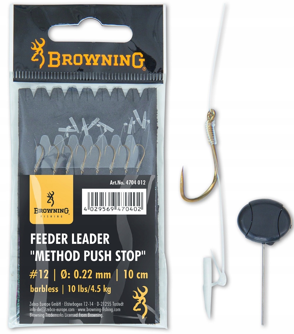 Метод Браунінг Фідер Пуск зупинка - це серія коротких лідерів риболовлі за методом методом . Лідер був зроблений на рибальській лінії Cenex з сильним гаком -мустадом у Unhea -Le -Free закінченим із зупинкою зупинки. Лідери загорнуті в єнот з піною Єви. Включає голку для натискання на зупинку . Характеристики