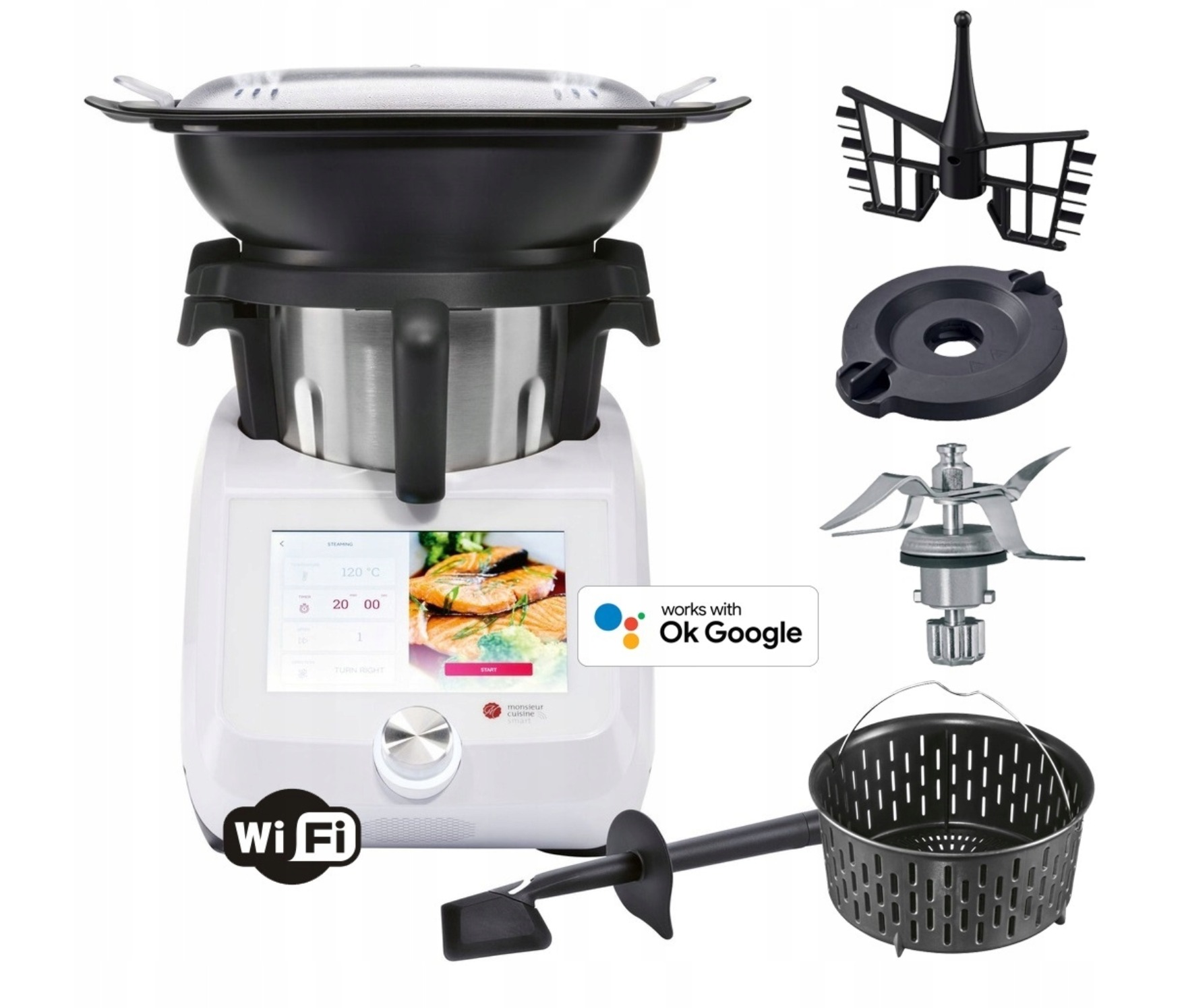 Пристрій Monsieur Cuisine Smart — це сучасний багатофункціональний пристрій потужністю 1000 Вт, який, безсумнівно, збагатить вашу кухню. Smart Edition, на відміну від своїх попередників, має чутливіший і більший 8-дюймовий екран. Апарат допоможе вам на кожному етапі приготування страви, адже він варить, подрібнює, смажить, емульгує, пасерує, рубає, змішує, подрібнює, замішує навіть найвимогливіше тісто, вакуумує методом sous vide і навіть зважує ( рівно 11 функцій). ). Monsieur Cuisine Smart містить понад 600 рецептів смачних страв із покроковими інструкціями.