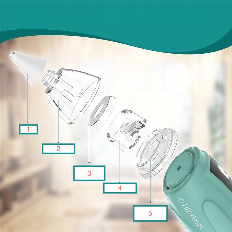 Назальний електричний аспіратор LifeBasis Hygienic має 5 потужностей всмоктування, 3 типи наконечників, які підходять для дітей від новонароджених до кількох років, і 3 види регульованої музики для кращого комфорту дитини.