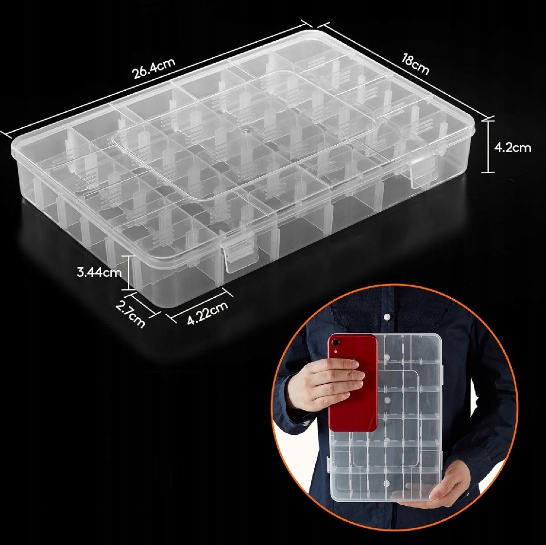 - Загальний розмір становить 26,4 х 18 х 4,22 см, розміри окремих відсіків - 4,22 × 2,7 × 3,44 см.