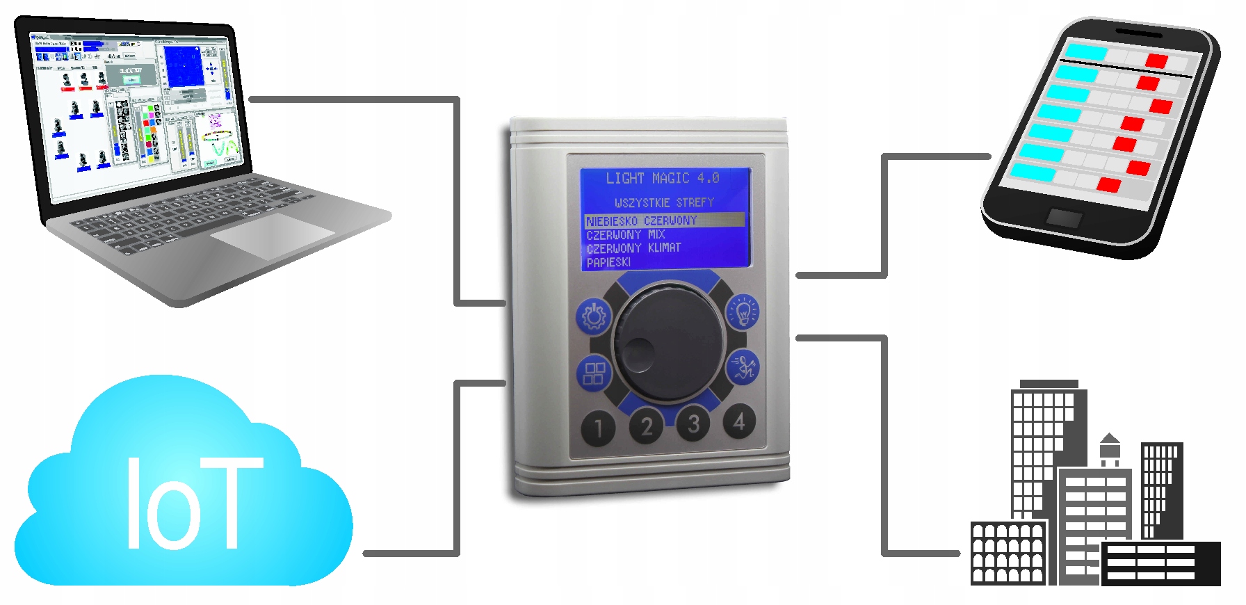 Light Magic 4.0 — це універсальний зональний контролер DMX. Пристроями можна керувати через комп’ютер, до якого підключено зовнішній інтерфейс, або через сам інтерфейс. Мережеві рішення, які використовуються в інтерфейсі, дозволяють керувати освітленням з будь-якого пристрою за допомогою веб-браузера, наприклад, комп’ютера, смартфона або планшета. Через мережу LAN інтерфейс можна інтегрувати з пристроями або системами IoT: Modbus TCP/IP, BMS або KNX.