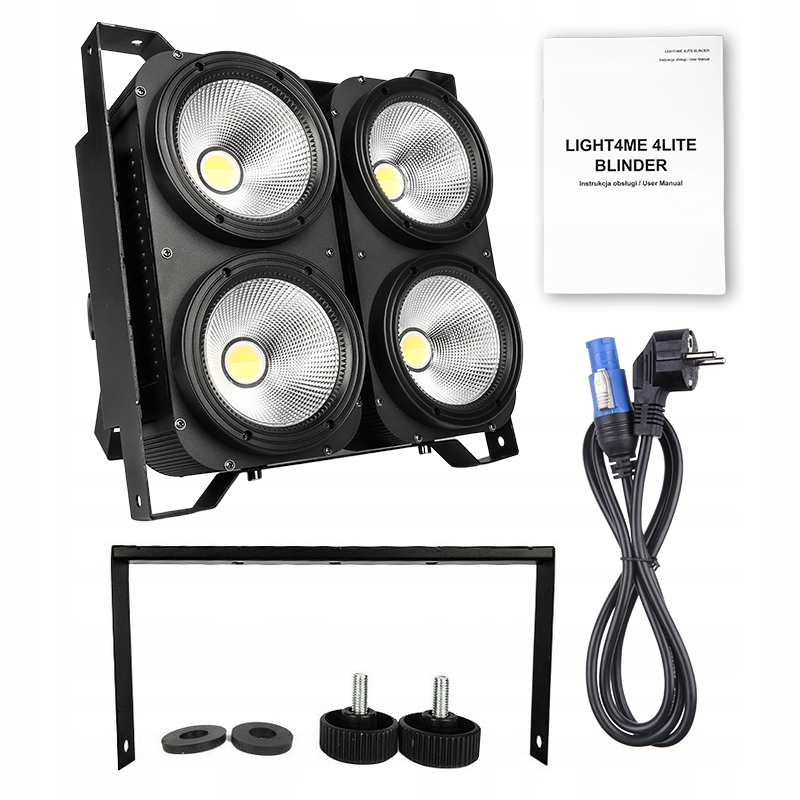 - У комплекті: Освітлювач сцени Light4Me 4Lite Blinder, тримач і елементи кріплення, шнур живлення (powercon), посібник користувача (EN/PL)