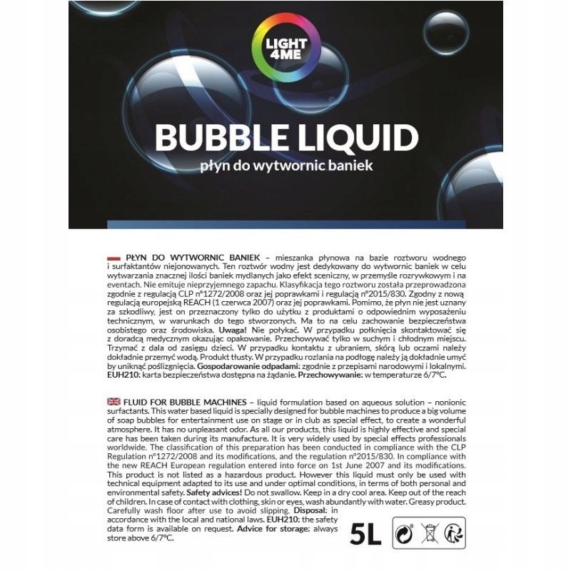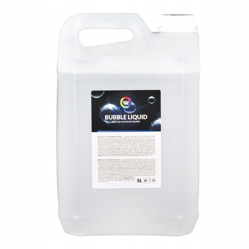 Професійна, без запаху та дуже ефективна рідина для бульбашок на основі суміші чистої води та неіоногенних ПАР. Рішення широко використовується, особливо в індустрії розваг. Його можна використовувати для створення сценічних ефектів під час вистав та різноманітних заходів. Створені з нього мильні бульбашки мають міцну структуру, і в той же час вони легкі і довго залишаються на повітрі. Bubble liquid Light4Me особливо рекомендований аніматорам ігор та розваг для дітей, парків розваг, компаніям, які організовують різноманітні заходи, а також приватним особам.