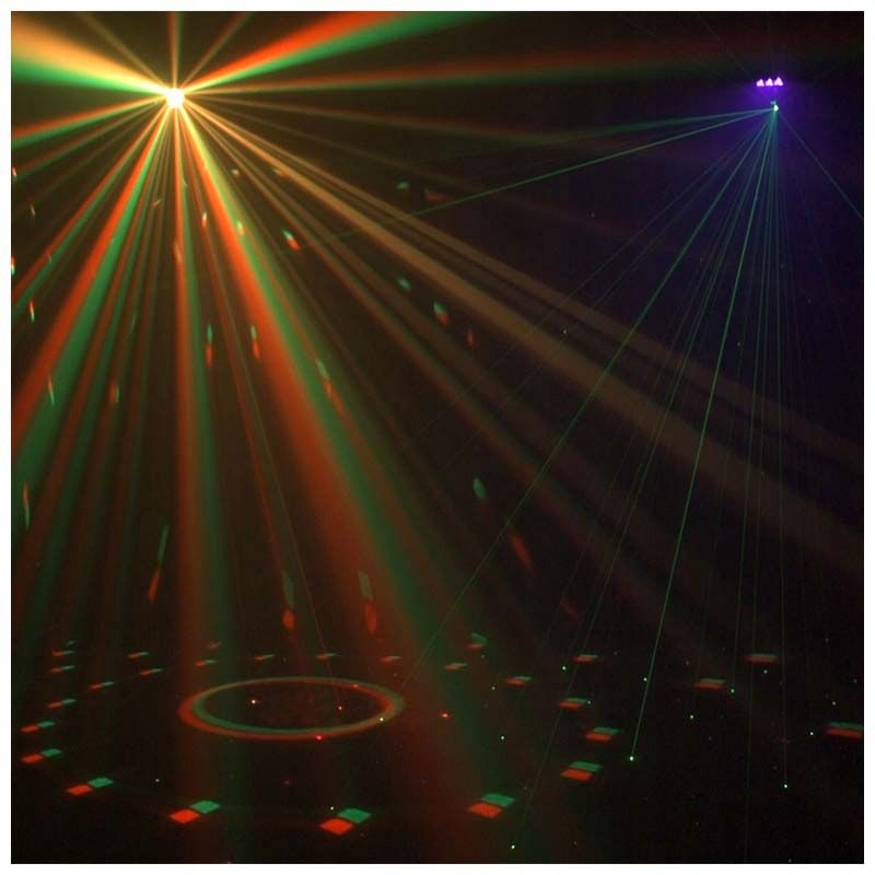- Універсальні світлодіодні ефекти – дискотечна куля, пральний PAR, ультрафіолет і лазер в одному пристрої.