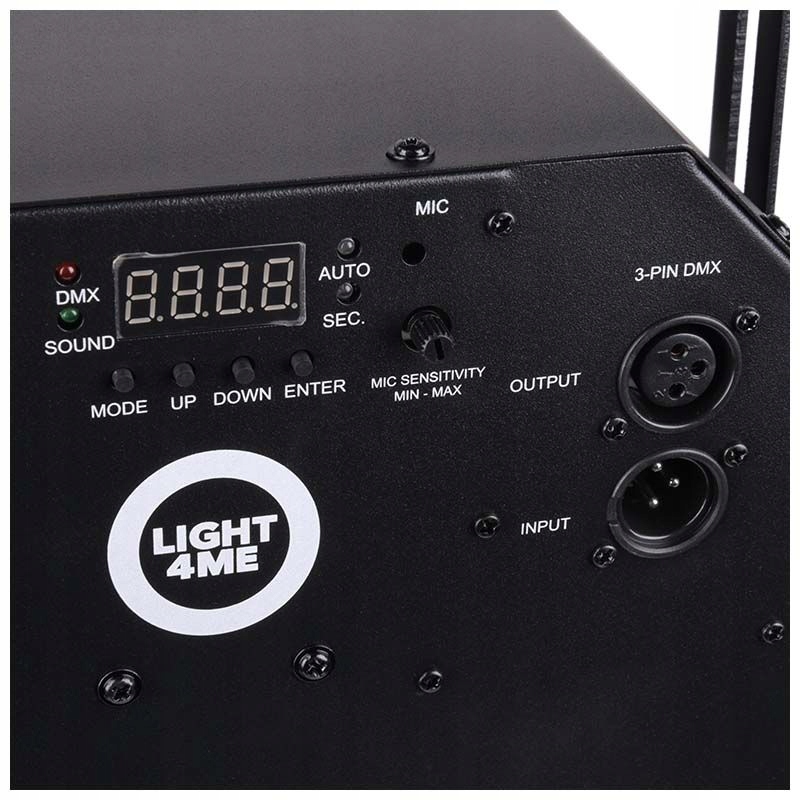 Light4Me Octaled — ідеальне освітлення для мобільні діджеї. Ефект має міцний металевий корпус, оснащений монтажним кронштейном, який дозволяє вільно розміщувати мультиефект на освітлювальних стійках, пандусах і фермах. На задній частині корпусу знаходиться панель управління, що складається з цифрового дисплея і 4 кнопок. За допомогою нього ми можемо вносити зміни до налаштувань меню та вибирати режим роботи пристрою, який нас цікавить: