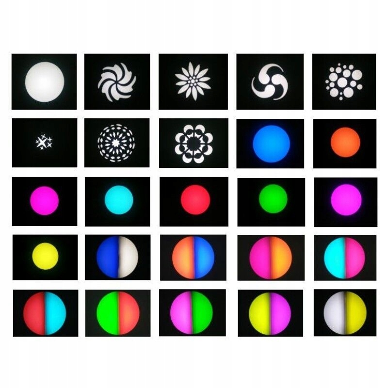 - Диск із 9 візерунками гобо та 8 кольоровими фільтрами.