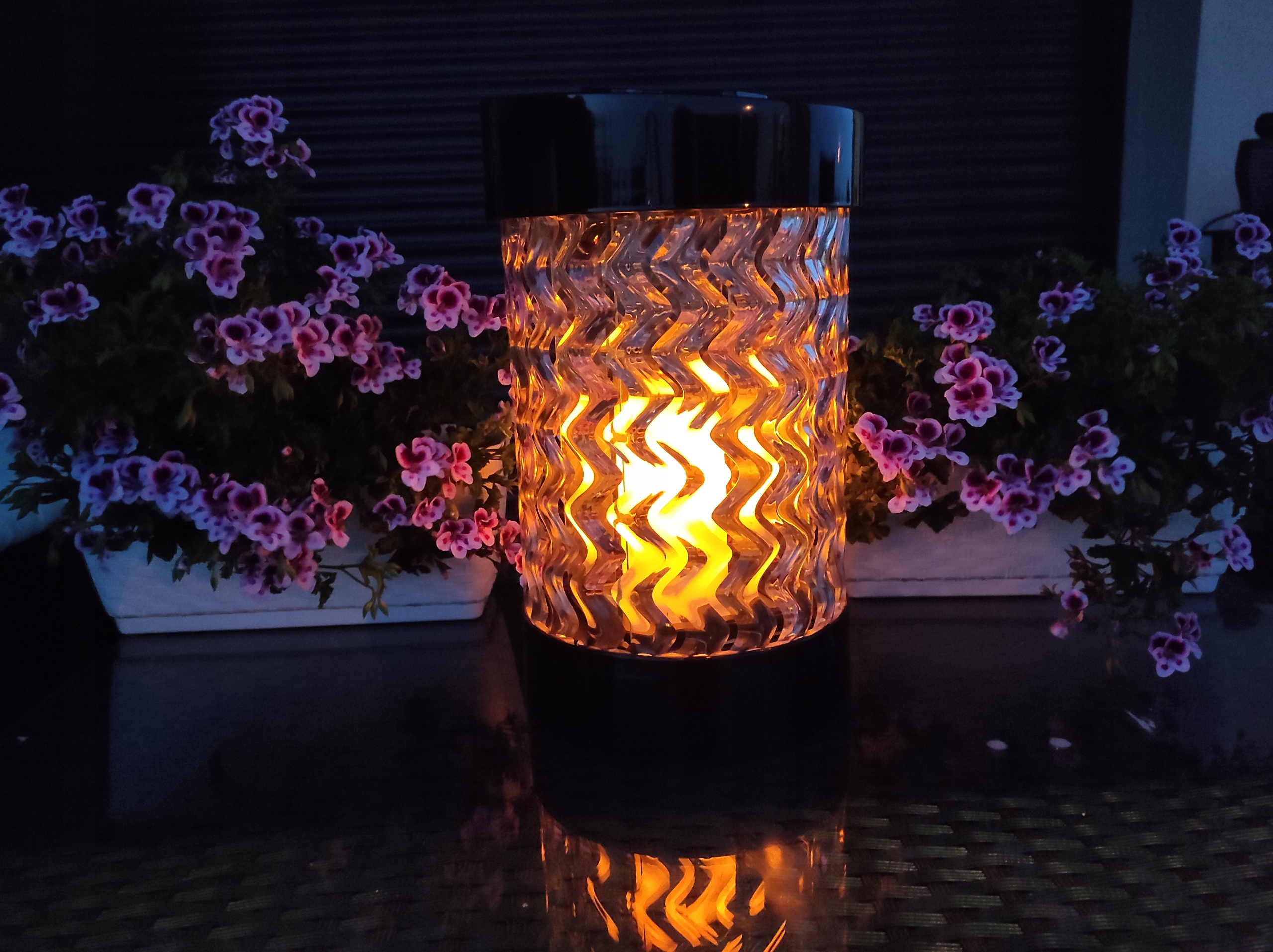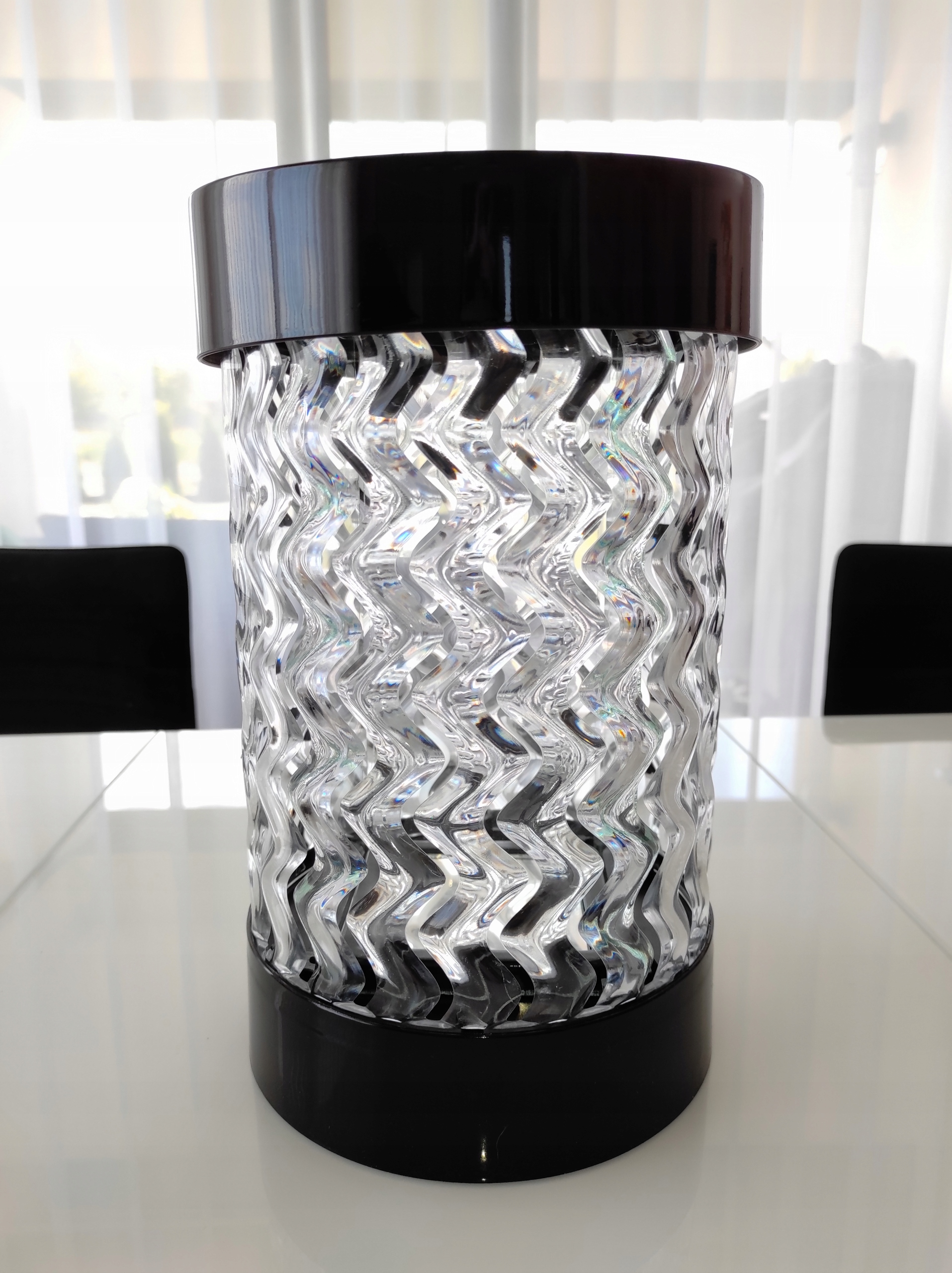 Красива сучасна велика свічка з пластику (основа, кришка, декоративні смуги) та скла.