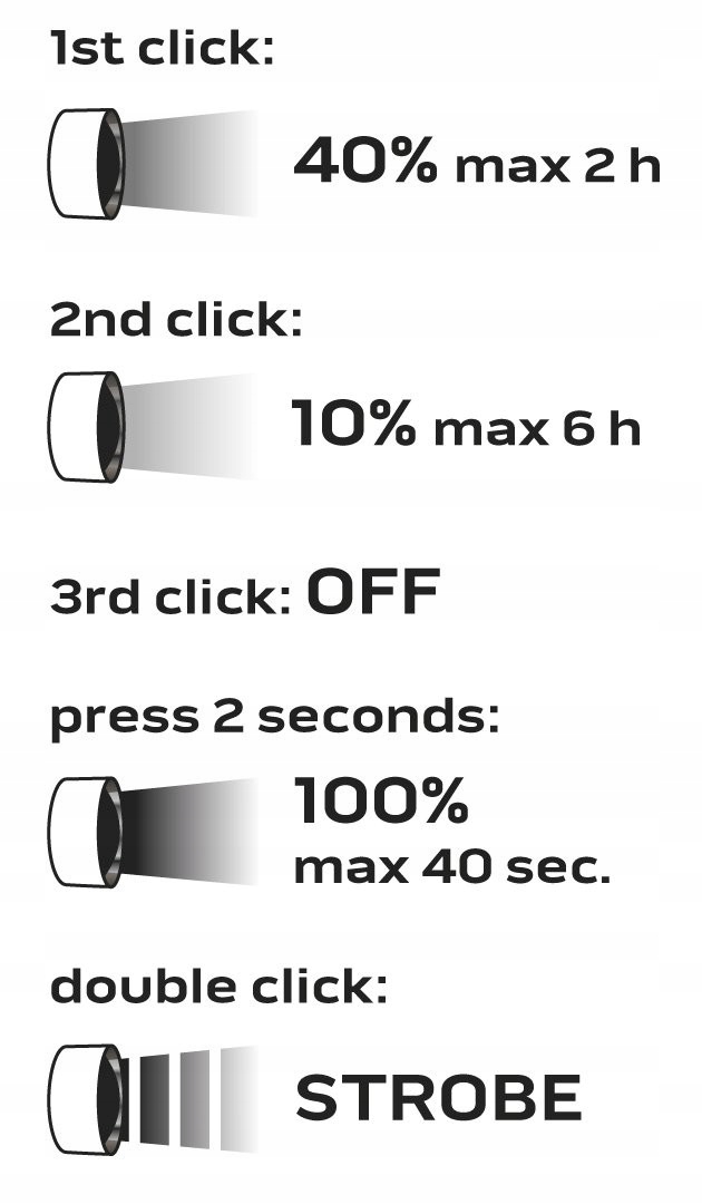 • Режими роботи: 100% (макс. 40 с), 40%, 10%, стробоскоп