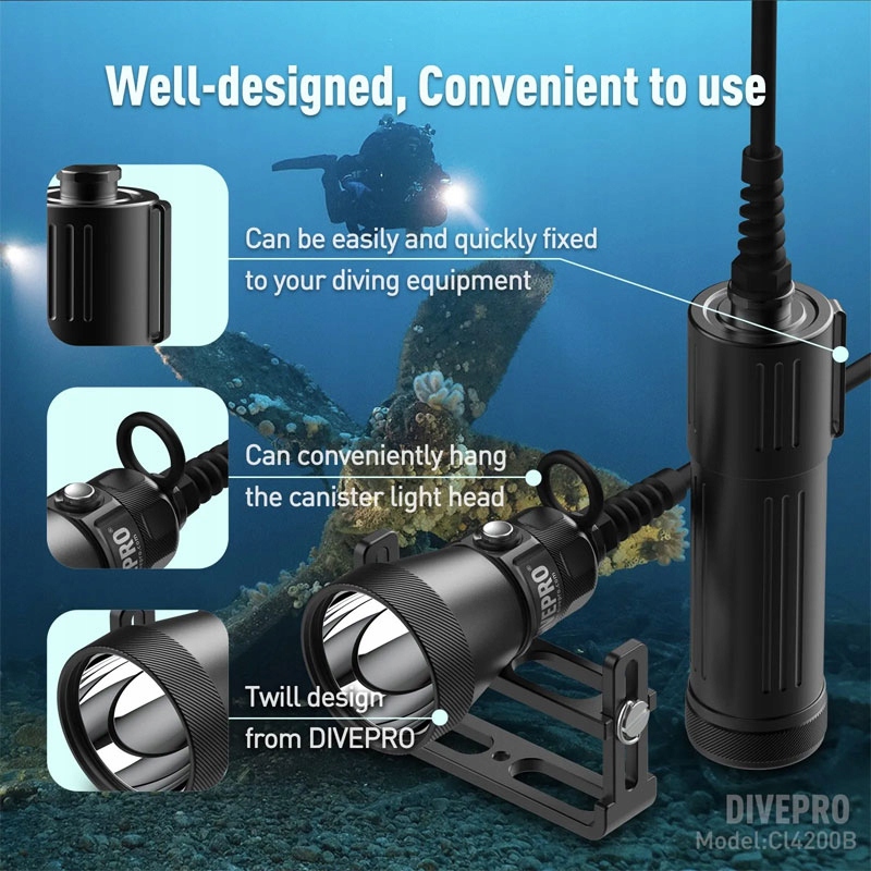 Каністровий ліхтарик CL4200BDivePro з потужністю 4200 люмен і часом роботи 210 хвилин при максимальній світловіддачі.