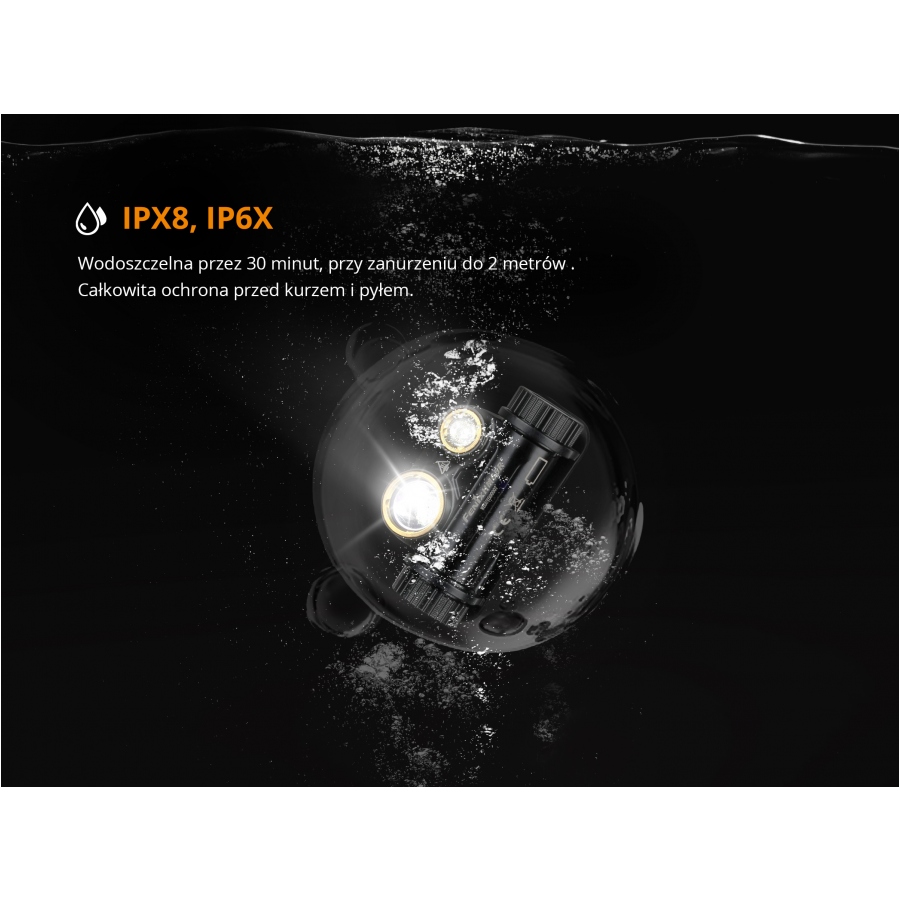 ФАРМ FENIX HM65R оснащений захистом від перевернутої поляризації, захищаючи від неправильної установки акумулятора. Ліхтарик характеризується високим класом захисту IP68 , що означає, що він стійкий до пилу, пилу, сильного дощу і навіть повного занурення у воду (2 м) протягом 30 хвилин. Тому HM65R можна успішно використовувати в будь -яких погодних умовах, практично будь -яких фізичних навантажень. Комфортно носити ліхтарик на голові забезпечується модернізованою гумкою, зливає піт і оснащений світловідбиваючими вставками, збільшуючи нашу видимість та безпеку, рухаючись вночі по дорозі чи сліду. HM65R використовує постійний контролер управління, який гарантує більш тривалу роботу ліхтарика /p>