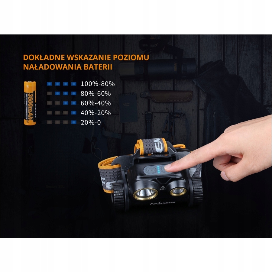 Основне джерело світла ліхтарика- Ефективний діод Cree XM-L2 U2 , який випромінює максимальний потік 1000 люмен з прохолодним кольором, рекомендованим для всіх програм, що потребують інтенсивності та Максимальна яскравість. Також використовували діод (з нейтральним кольором) . Ліхтарик, звичайно, має регулювання кута освітлення , що робиться шляхом відхилення всього модуля ліхтарика. Працює від акумулятора 18650 року (включений), який також може замінити 2 одноразові акумулятори CR123. Однак ми рекомендуємо використовувати акумулятор 18650 року, який гарантує повні параметри світла та більш тривалу роботу ліхтарика. Ця модель встановила порт USB-C, який дозволяє заряджати акумулятор з високим 1,5 і без необхідності витягувати його з пристрою. Це дуже функціональне рішення в ситуації, коли ми плануємо довгу роботу за допомогою переднього ліхтарика. Для використання двох кнопок операція ліхтарика дуже проста і зручна і, головне, вона не вимагає зняття ліхтарика з голови. Кожен випромінювач підтримується окремим перемикачем, який також використовується для зміни рівня яскравості. 4 .). emiter xp-g2 r5 з дифузеним світлом має 3 режими : високий (400 люмен), середній (130 люмен) і низький (8 люмен). У режимі 1000 люмен ліхтарик працює до 4 годин (залежно від використовуваного акумулятора). Потік ліхтарика можна збільшити навіть до 1400 люмен , включаючи два світлодіоди