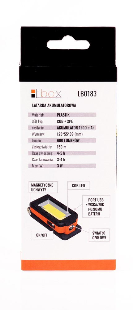 Ліхтарик для майстерні Libox виготовлено з твердого матеріалу ABS. Він має поворотну головку та два джерела світла: бічний світлодіод COB 500 люмен і передній світлодіод XPE 100 люмен. Чотири потужні магніти гарантують безпечне та безпечне використання. Додатковою перевагою є можливість зарядки через USB-кабель. Час роботи ліхтарика від 4 до 5 годин. Має багато режимів, які можна змінювати за допомогою кнопки живлення на бічній панелі ліхтарика. Він зручний і складається.