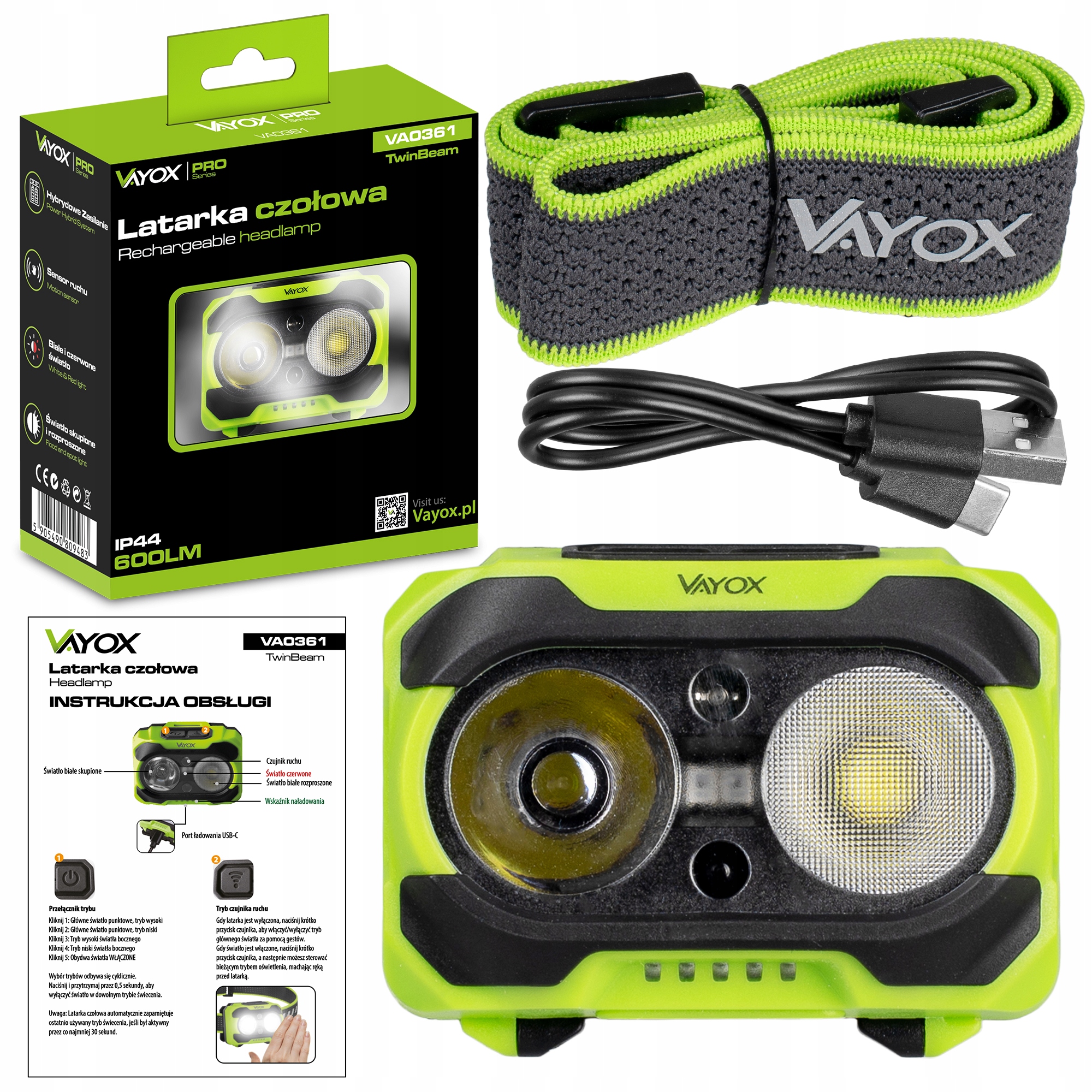 - кабель usb-c, ліхтарик va0361, пов'язка на голову , оригінальна упаковка