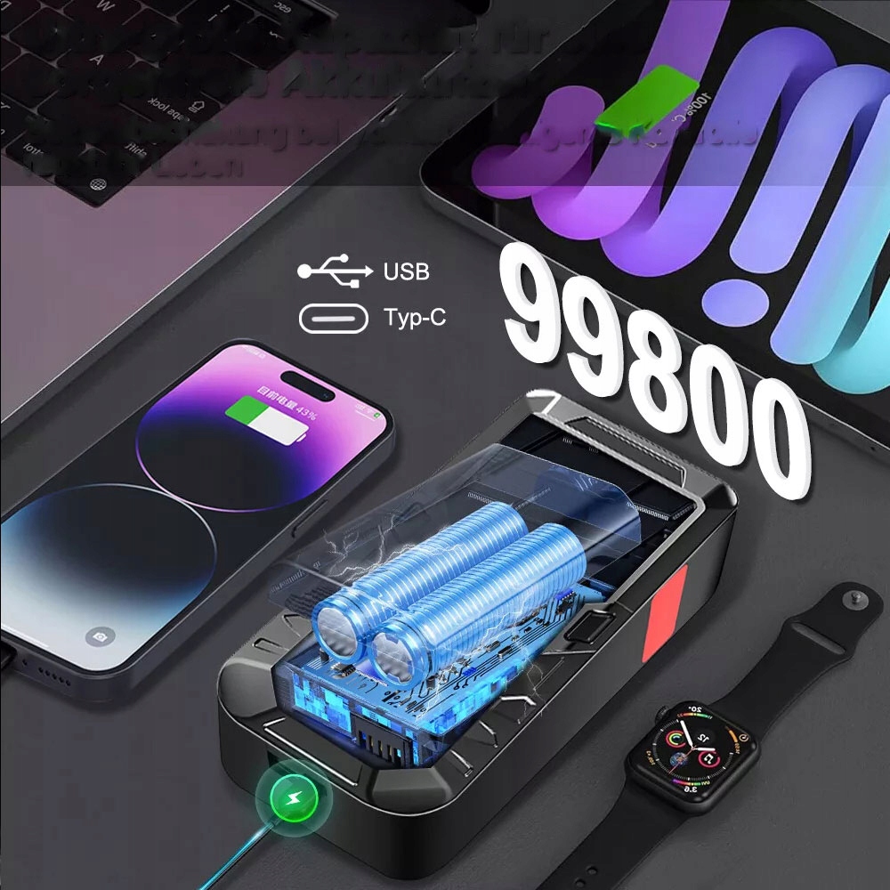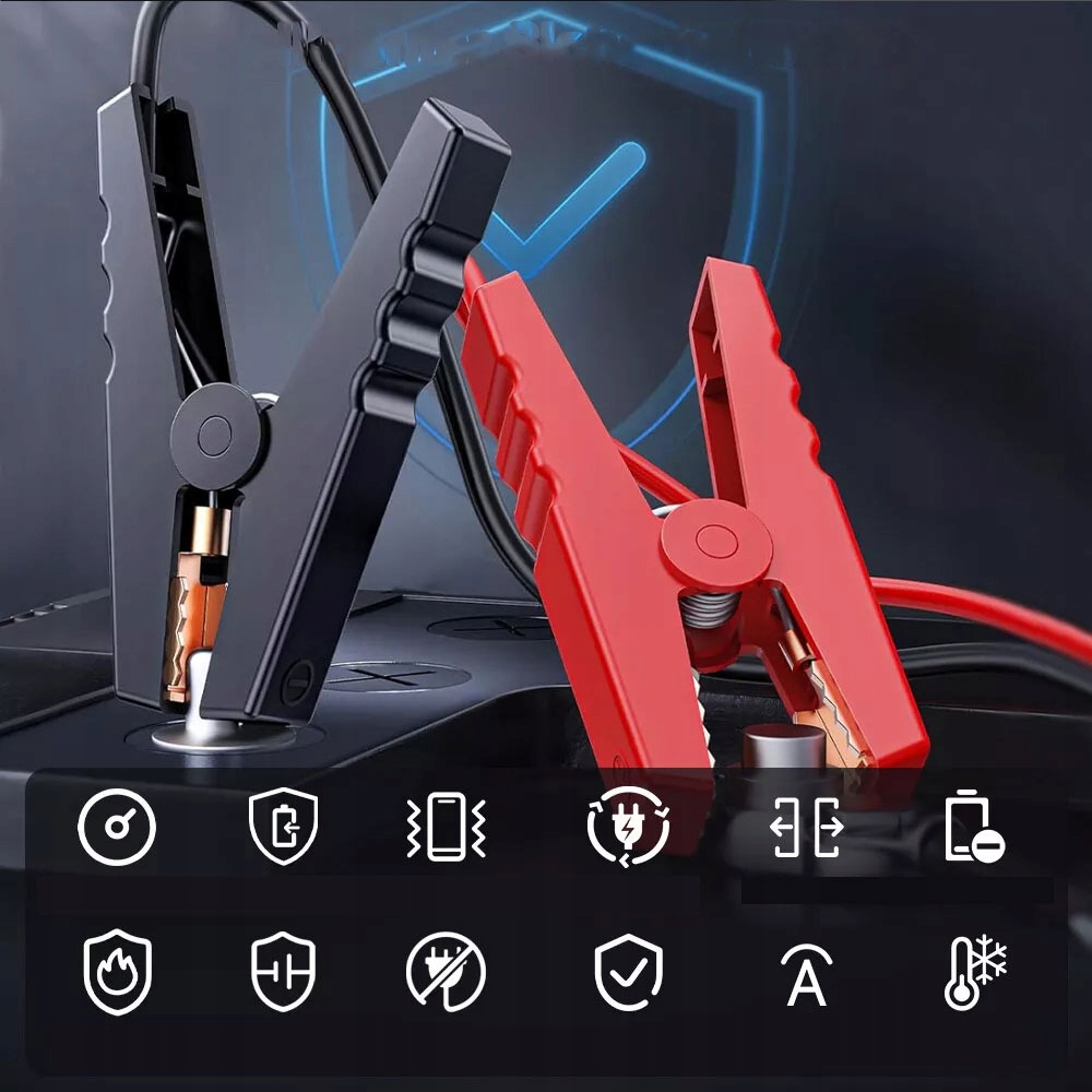 - він має чотири основні функції: він може використовуватися як джерело аварійного джерела автомобіля (з 10-центром подовжувачем), портативним мобільним джерелом живлення, світлодіодним ліхтариком з 3 режимами (суцільним світлом, стробом, соусом) та інтелектуальним насосом повітря. 1000 Піковий струм та ємність акумулятора до 99 800 мАг, він може швидко запустити 12 В бензинові транспортні засоби. Незалежно від температури, будь то -20 ° C або +60 ° C, забезпечує вам підтримку та готовність до водіння.