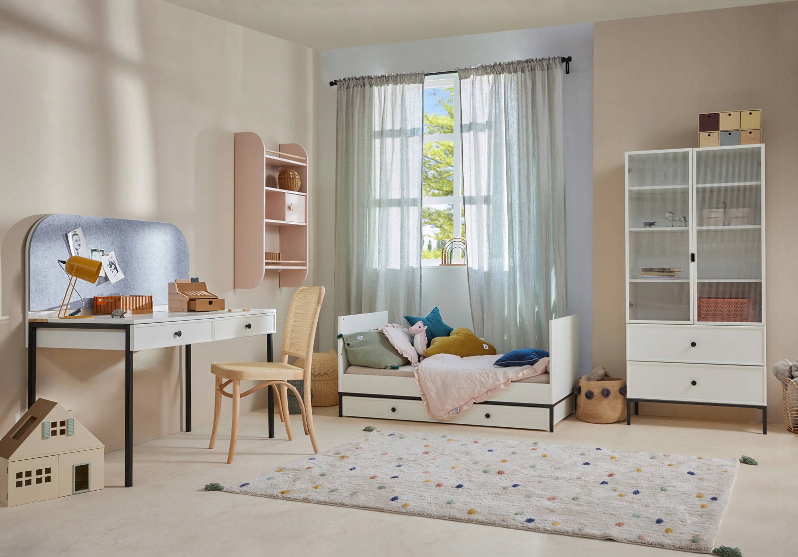 Колекція мінімалістичних, екологічних і простих дитячих меблів. Виразна геометрична форма, збагачена елегантними металевими деталями. Приховані рухомі елементи та звукопоглинальні панелі столу забезпечують належний комфорт і безпеку.