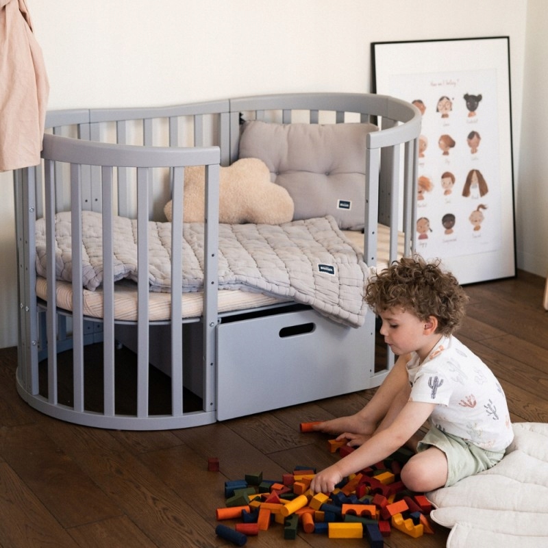Ліжко Waldin можна змінювати відповідно до ваших потреб - воно регулюється по висоті та має знімну передню частину. Завдяки цьому стандартне дитяче ліжечко перетворюється на ліжко для все більшої дитини, аж поки воно нарешті не стає манежем і ліжечком на підлозі в стилі Монтессорі.