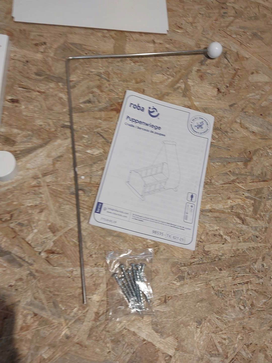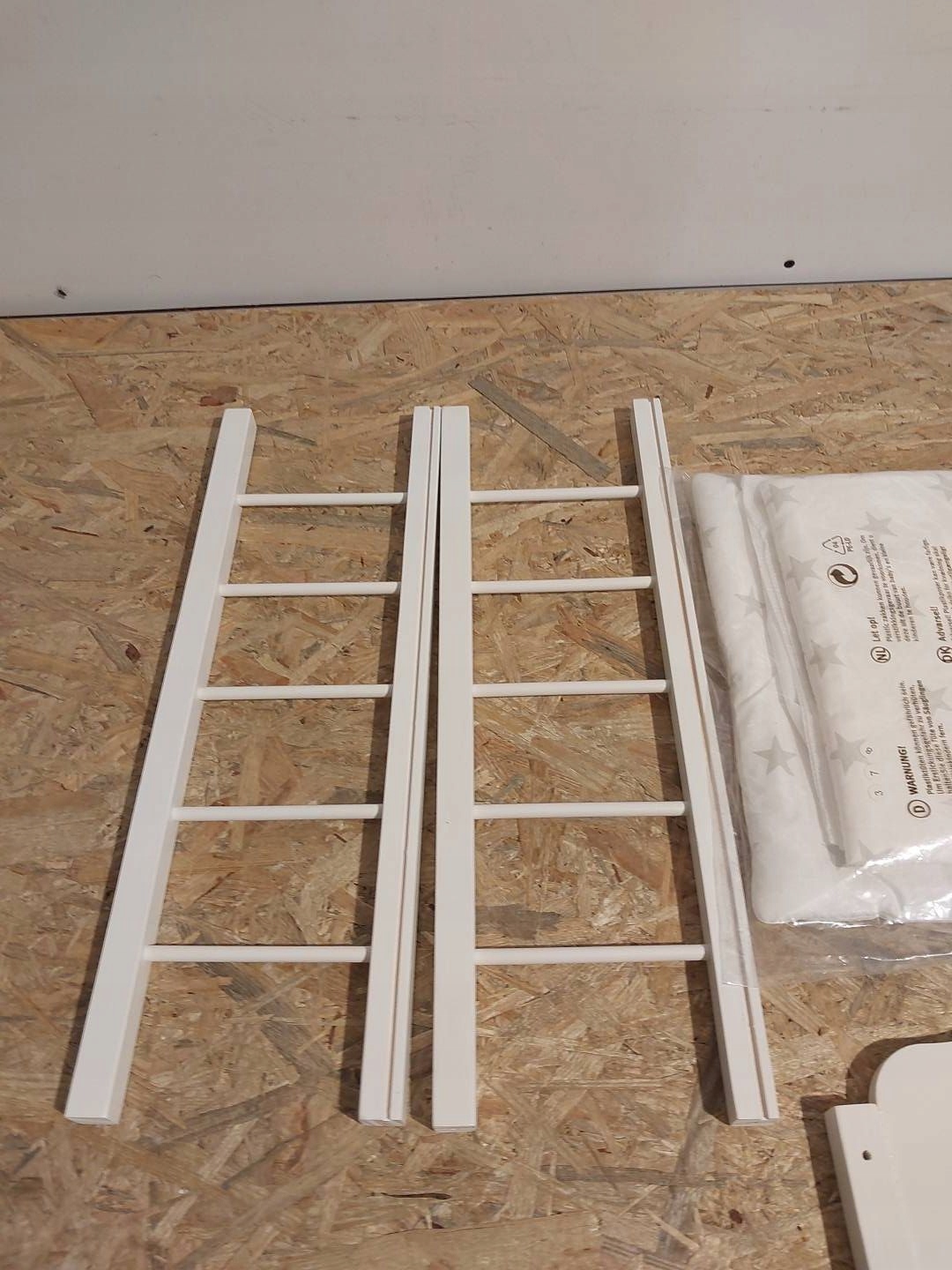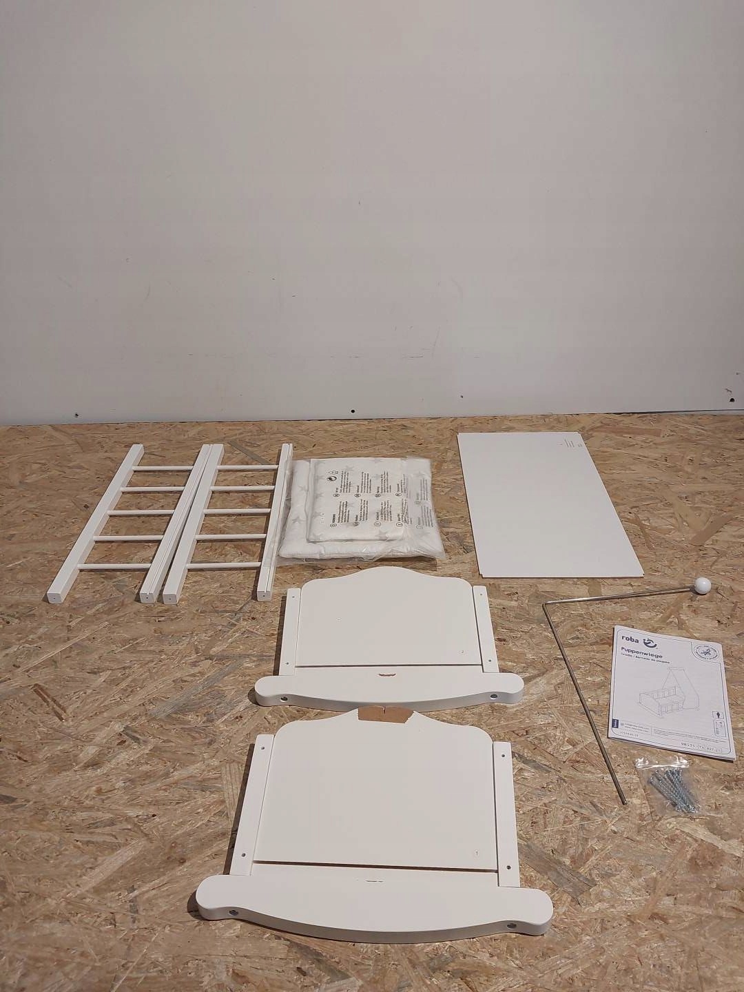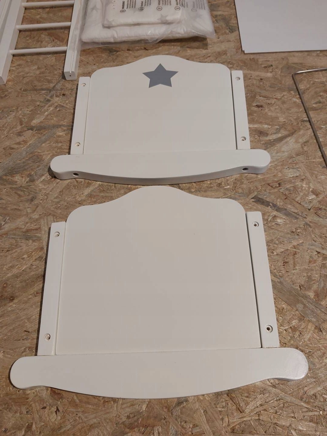 Лакована люлька білого кольору укомплектована постільною білизною (1x подушка, 1x ковдра) і балдахіном. Зірковий дизайн.
