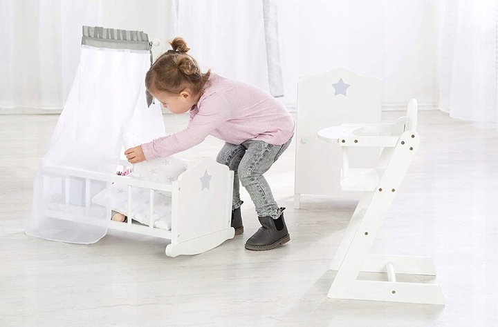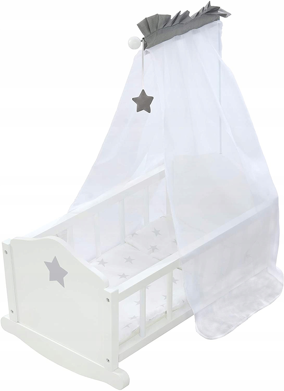 Лакована біла люлька укомплектована постільною білизною (1x подушка, 1x ковдра) і балдахіном. Зірковий дизайн.