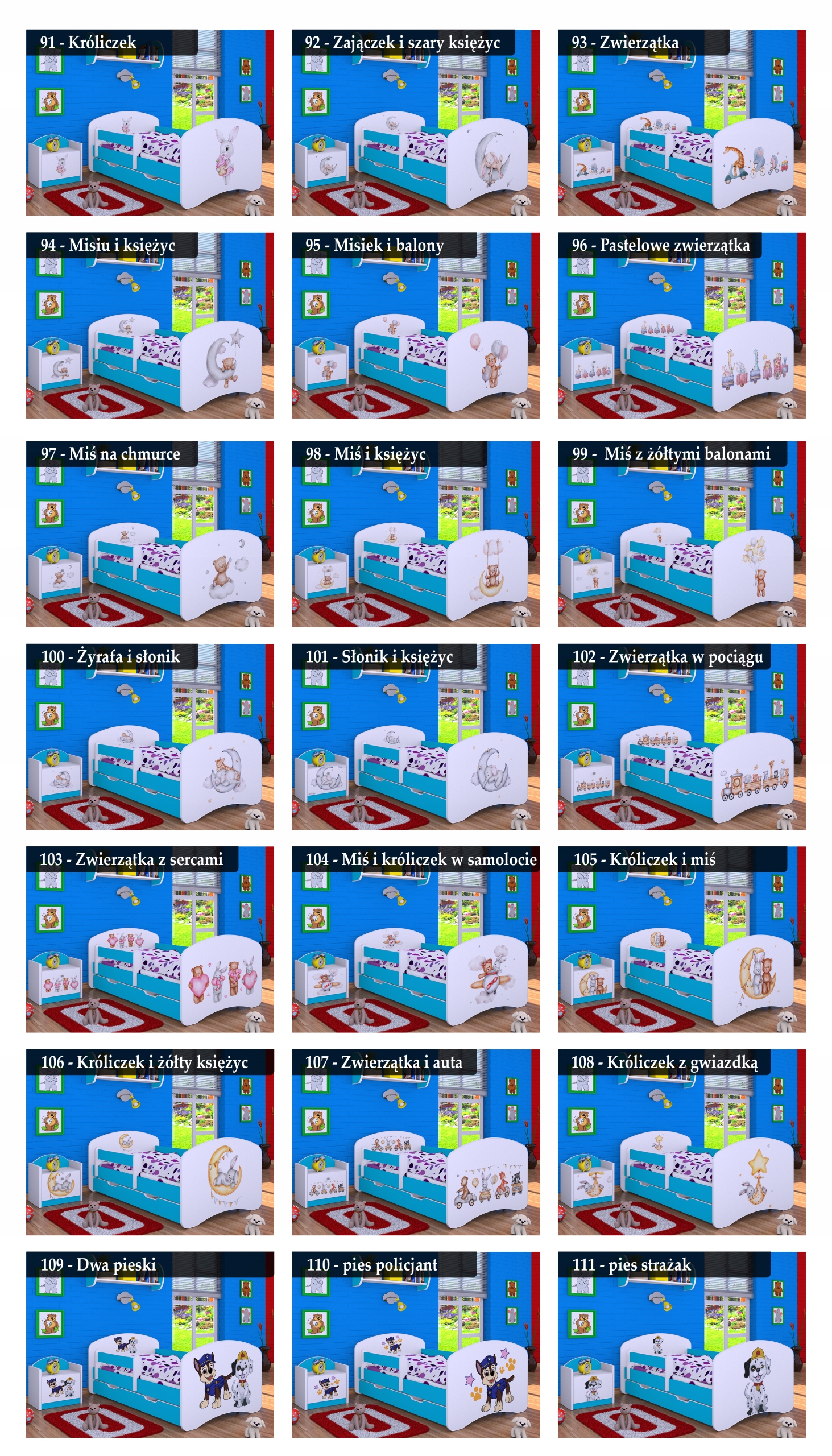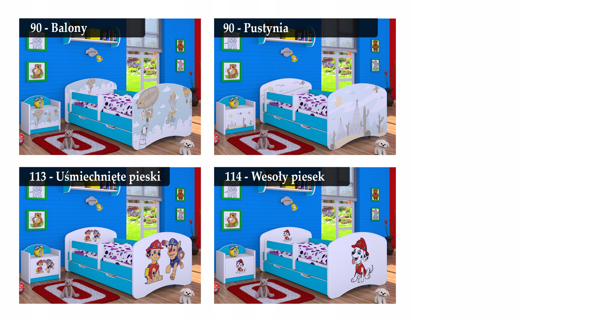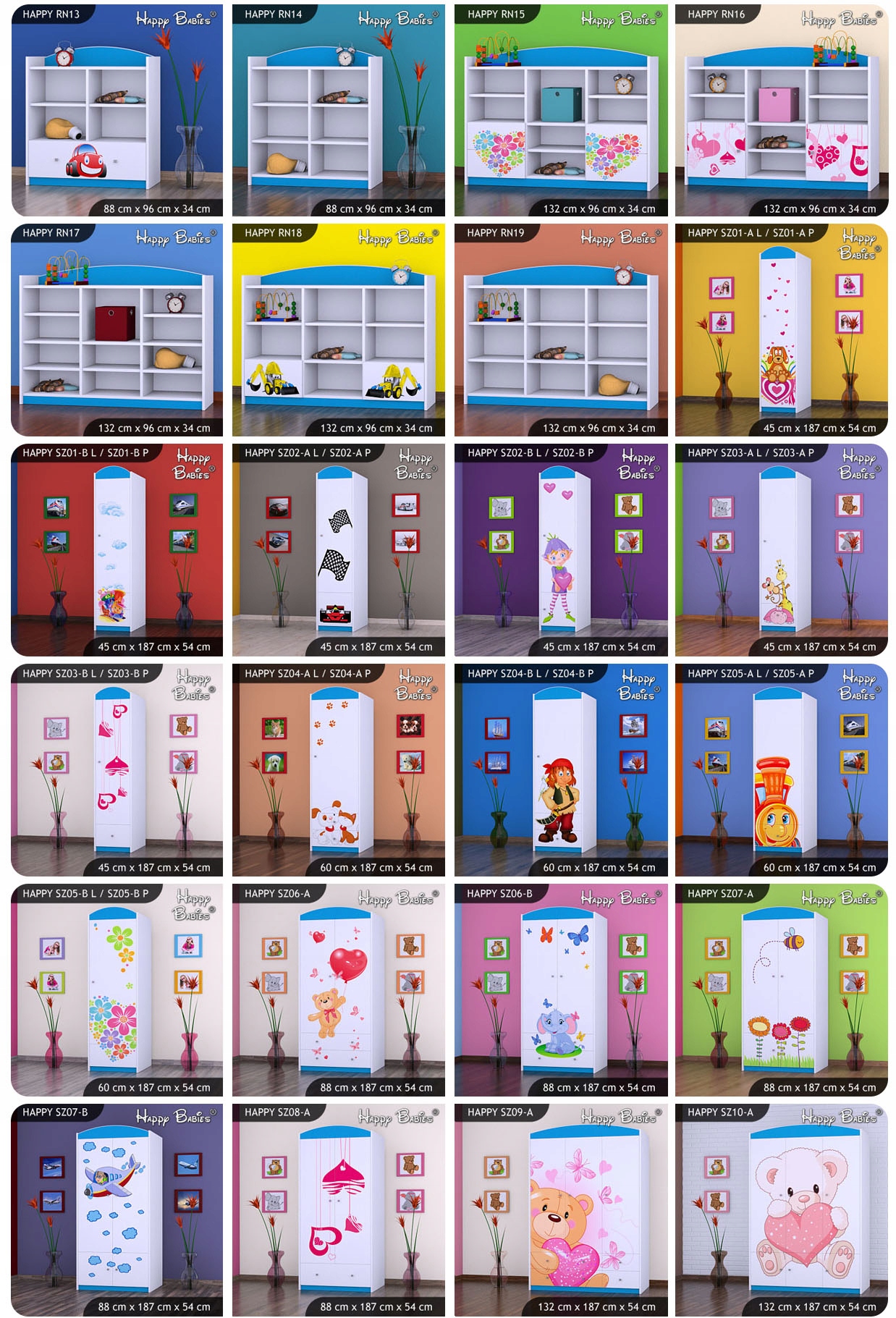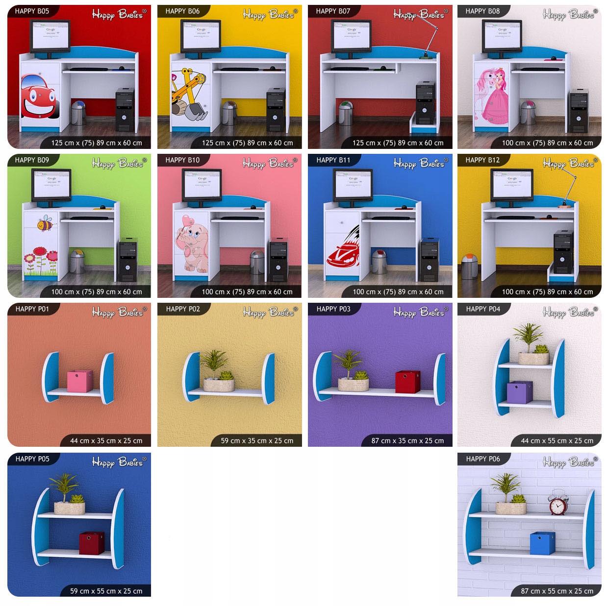 На вибір представлено майже 90 моделей меблів (тумбочки, скрині для іграшок, комоди, стелажі, шафи, столи, стелажі) призначені для будь-якого оформлення дитячої кімнати.