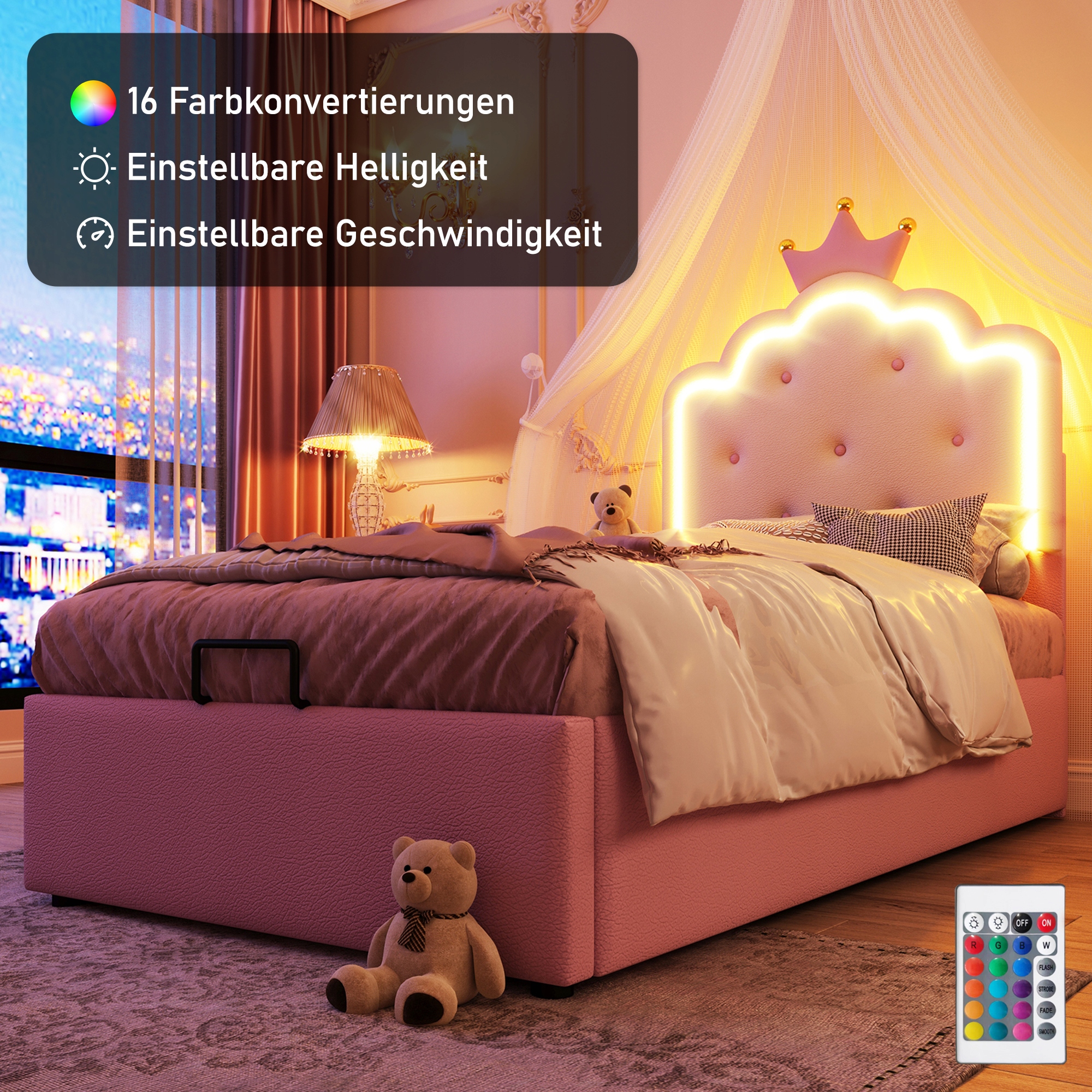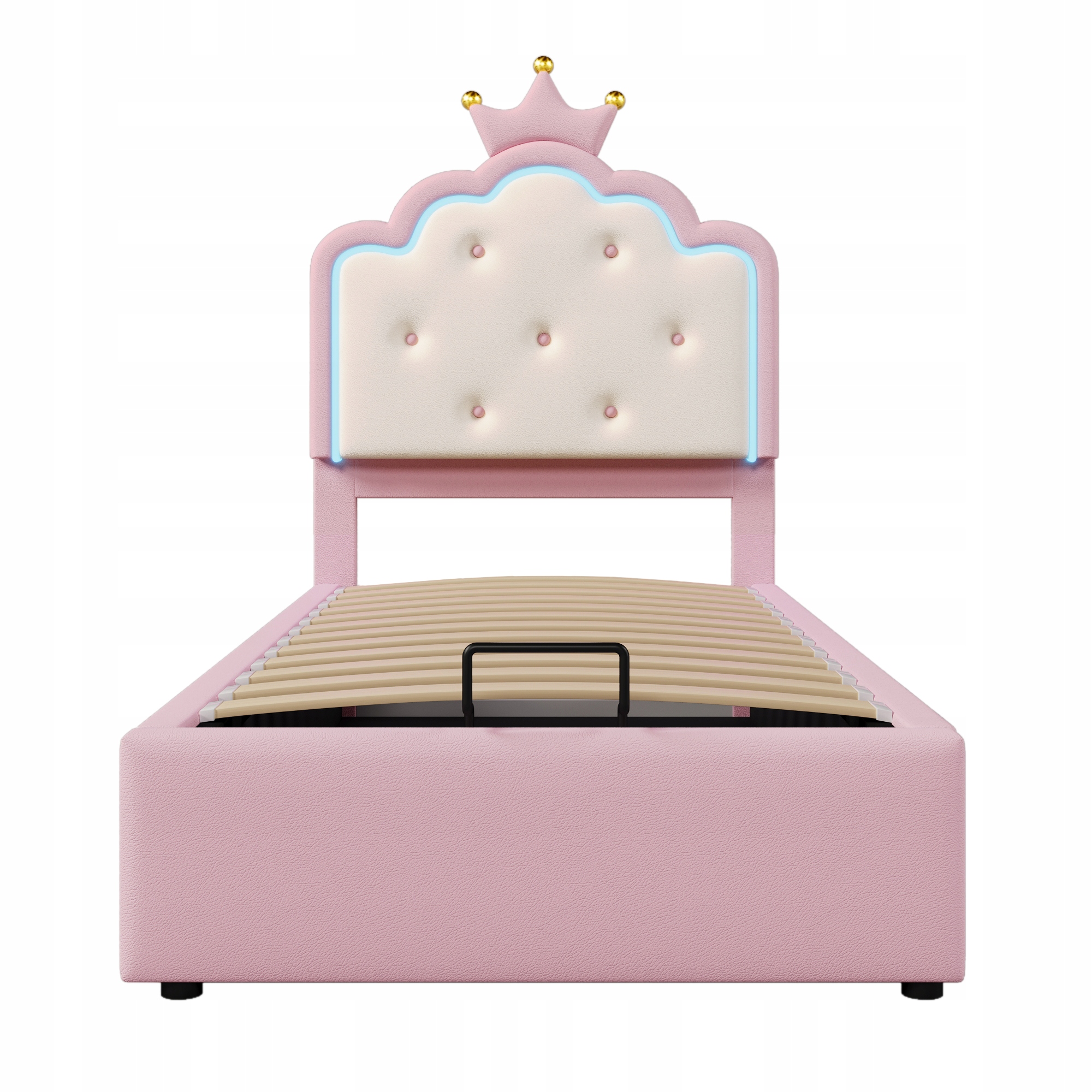 Ліжко з м’якою оббивкою, 90 x 200 см, з рейковою рамою (без матраца), зовнішнє освітлення з дистанційним керуванням, форма корони принцеси, матеріал PU, рожевий