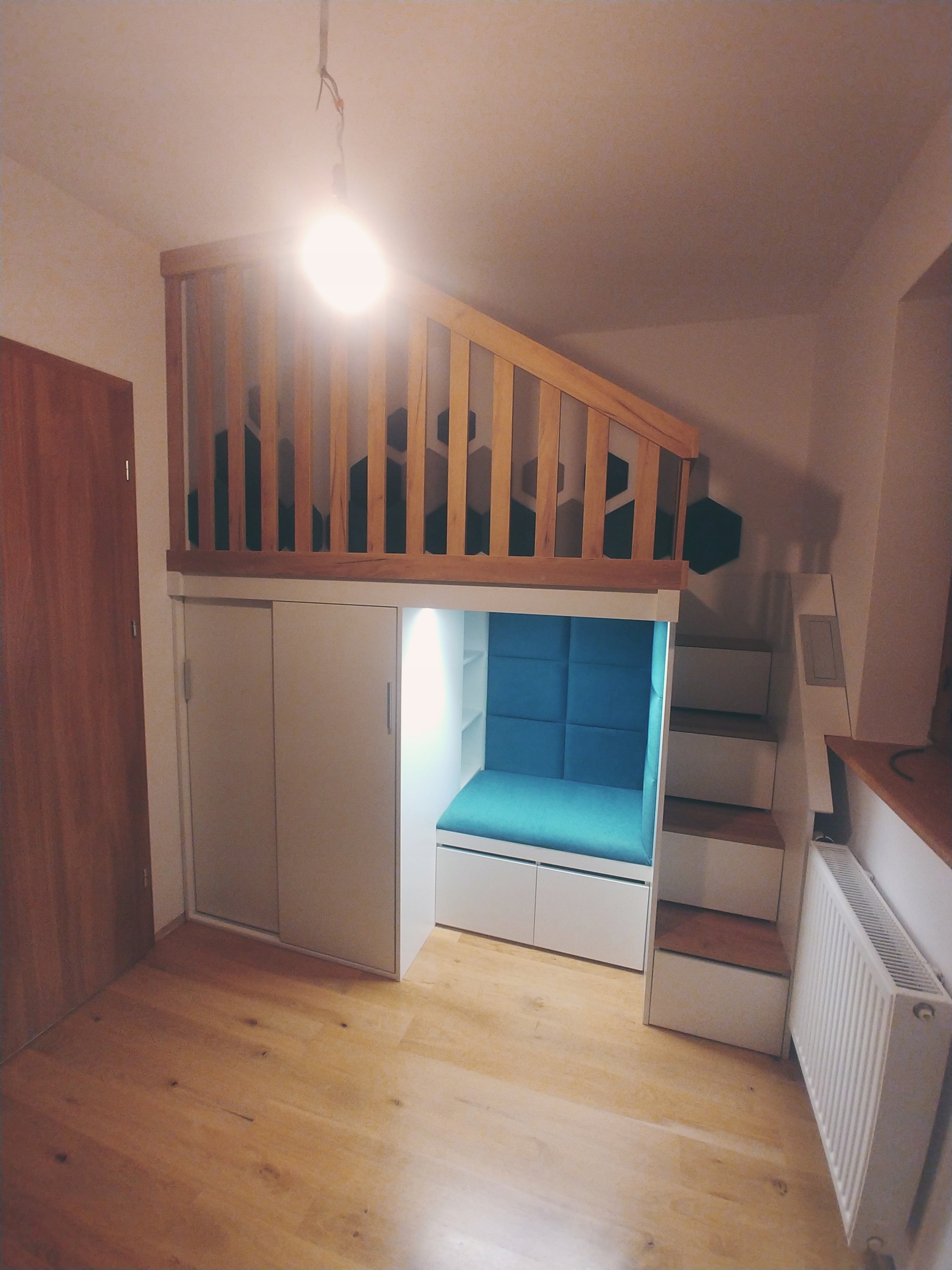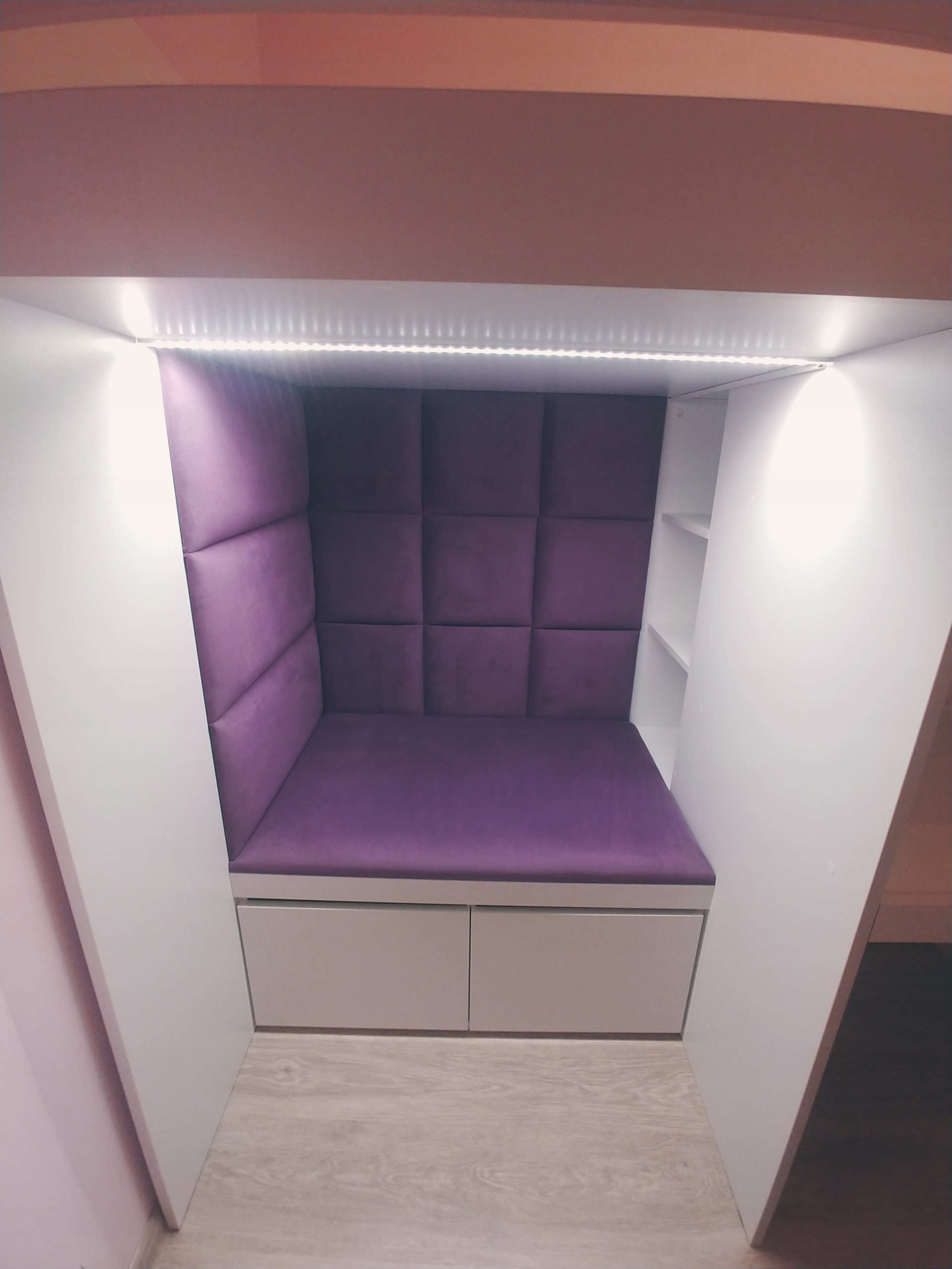 Ліжко Мері Оксамет - це антресоль з гардеробом або столом та зручним сидінням, яке робить це ліжко дійсно особливим. Ніша з сидінням - це інтимне місце для відпочинку та гри, а також виглядає надзвичайно привабливо.