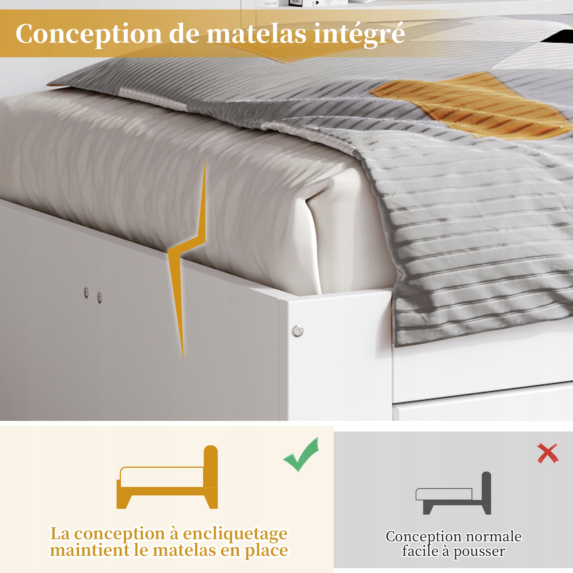 Вбудована система матраців використовує механізм клацання, щоб міцно утримувати матрац на місці, забезпечуючи безпеку під час сну та ігор. Ця розумна конструкція запобігає пересуванню, але дозволяє легко знімати за потреби, поєднуючи безпеку та зручність.