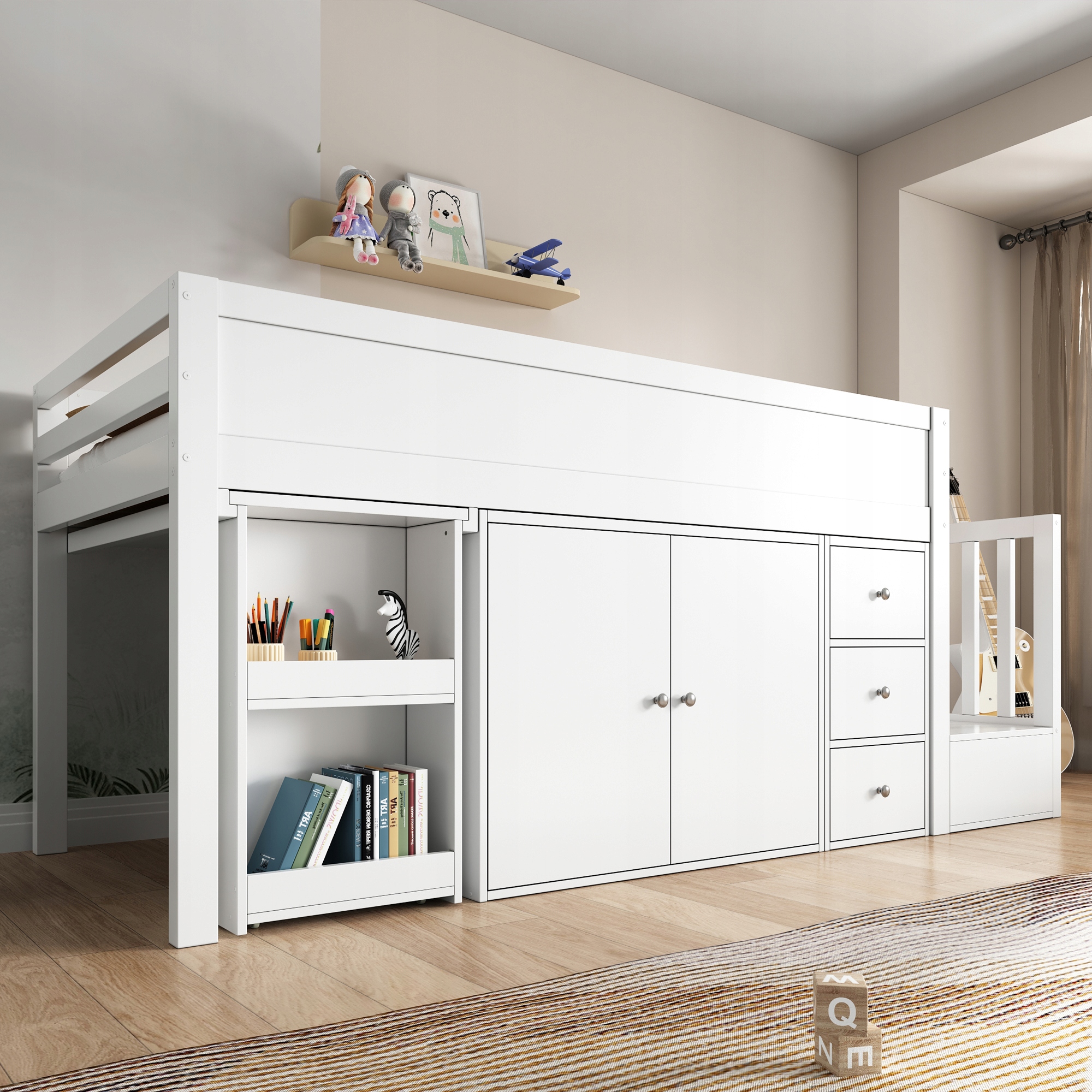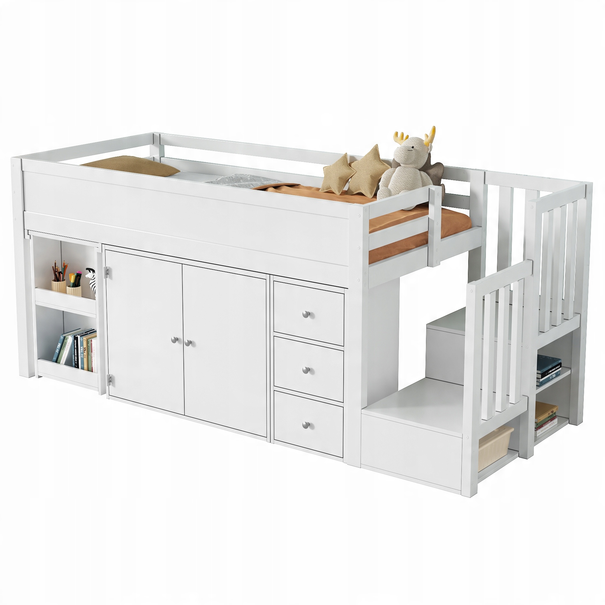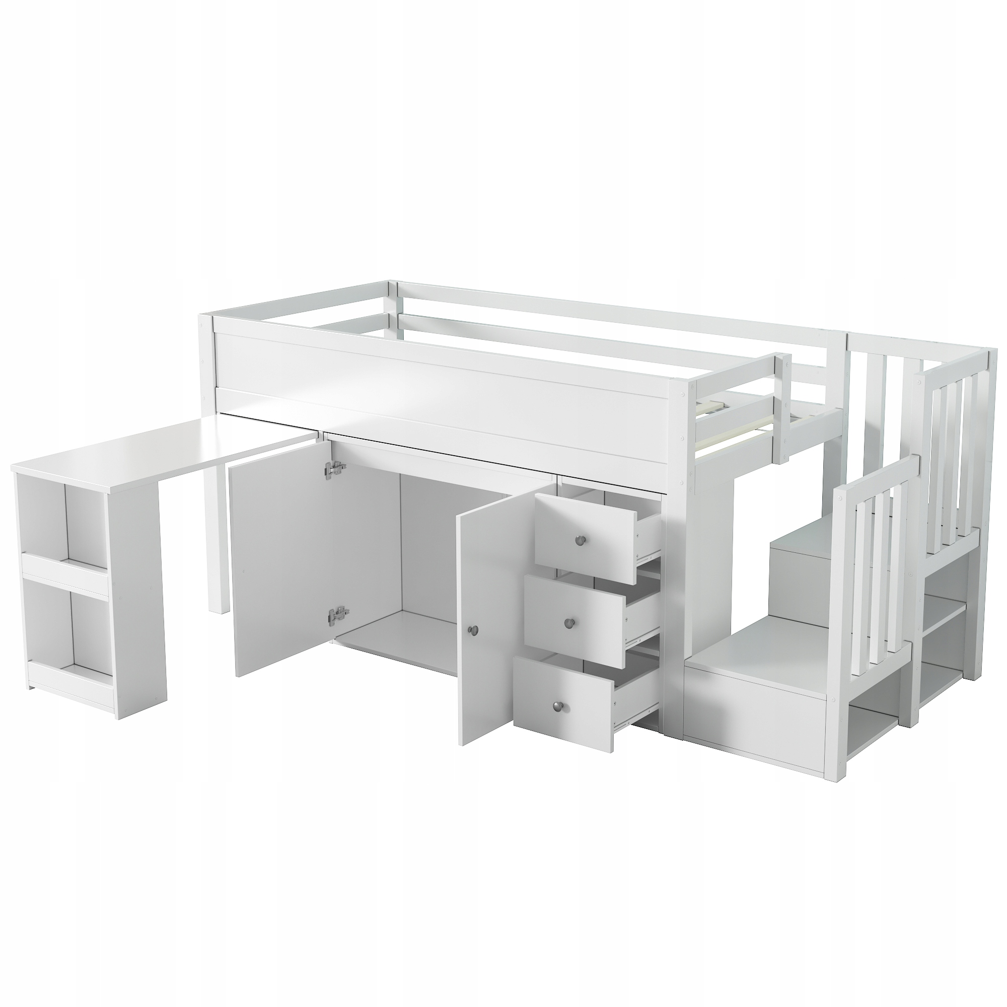 Дитяче двоярусне ліжко, багатофункціональне дитяче ліжко, з висувним столом і боковим ящиком, з тумбою, з ящиком, зі сходами та сходами, без матраца, МДФ, білий 90*200