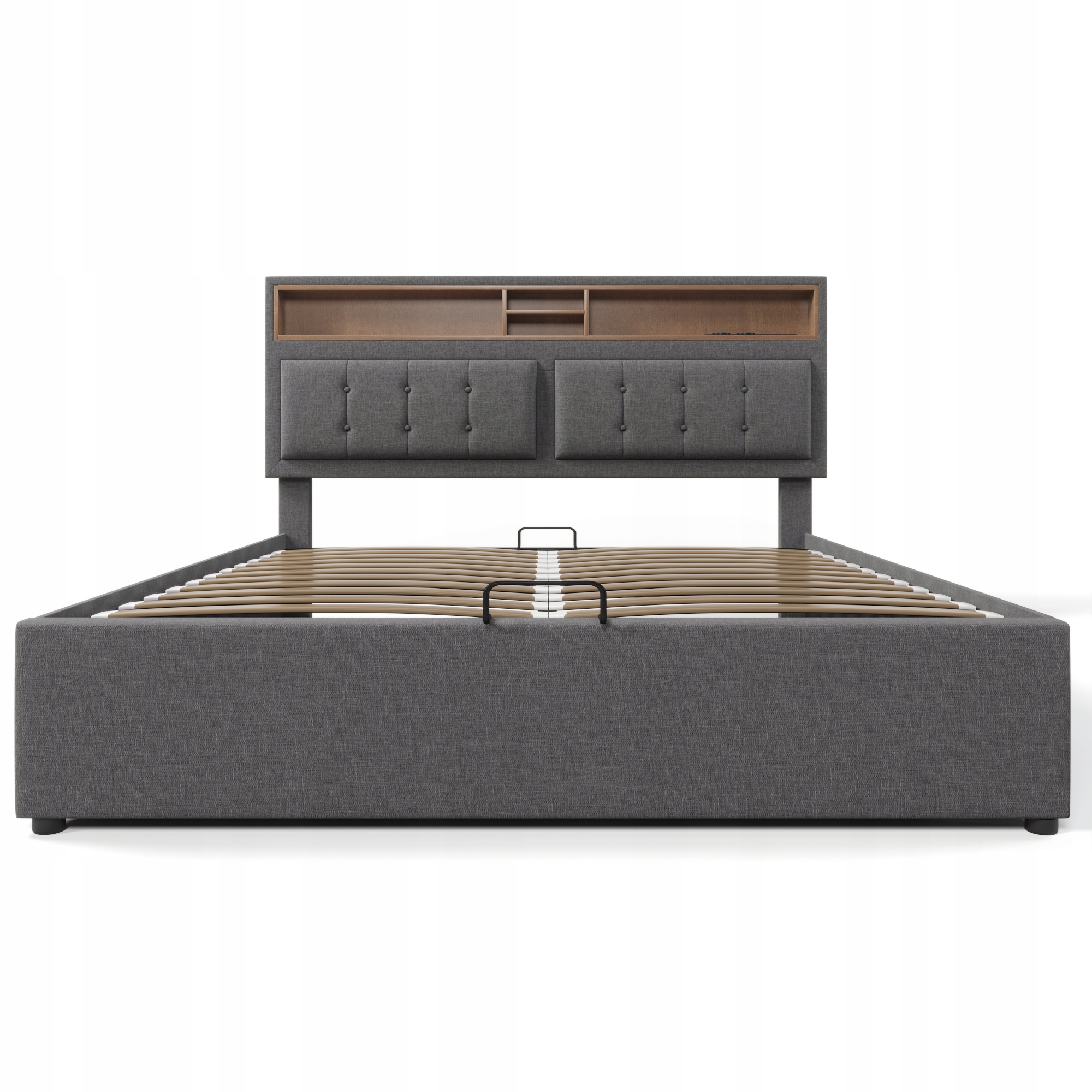Ліжко з м'якою оббивкою, двоспальне ліжко з розеткою USB C, функція зарядки, підголівник, місце для зберігання ліжка, каркас ліжка з лляного матеріалу, молодіжне ліжко 160x200 з рейковим каркасом (без матраца)