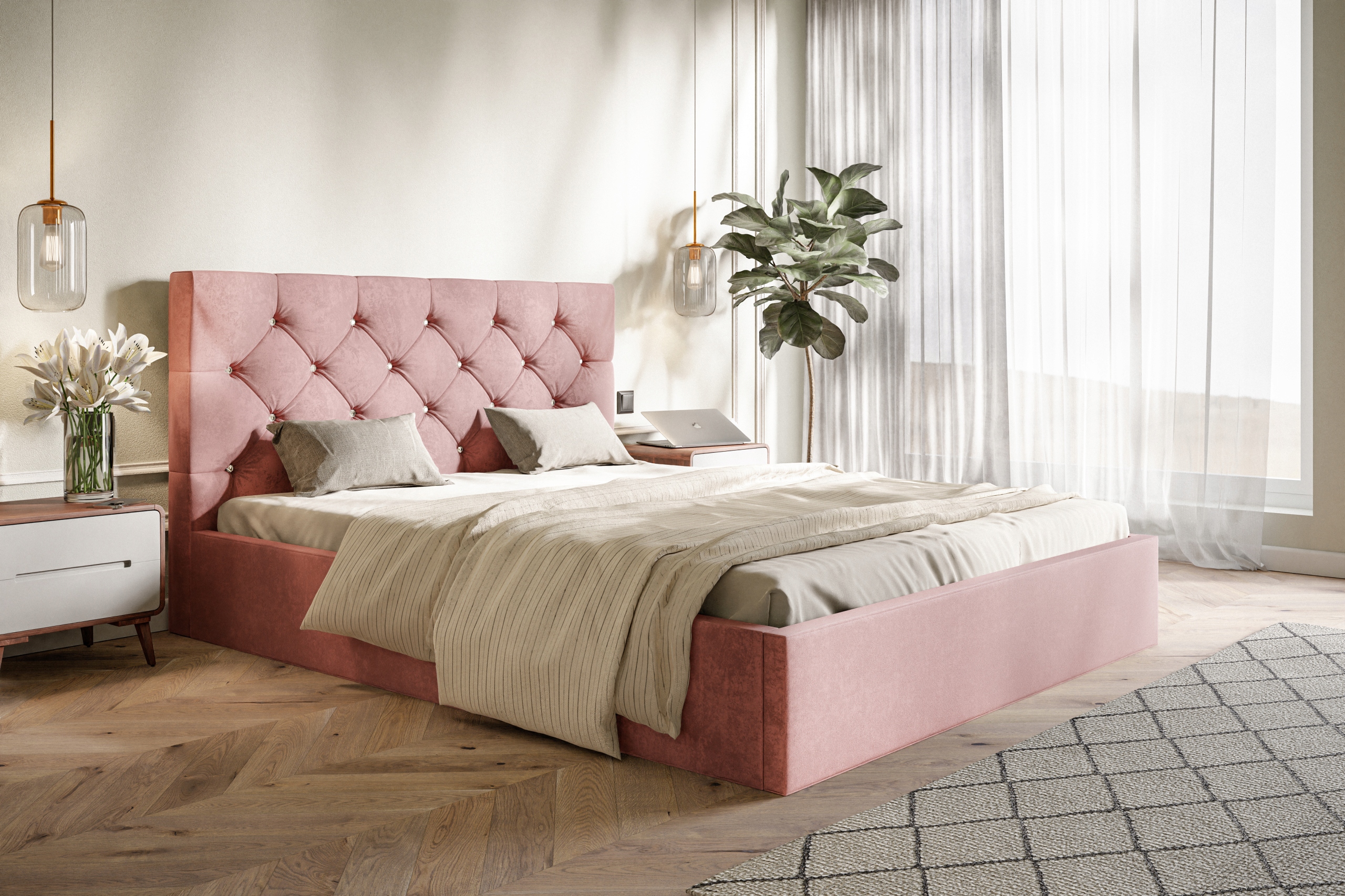 На візуалізації показано ліжко 160х200 зі стандартною висотою підголівника. Залежно від конфігурації кількість кристалів на узголів'ї може відрізнятися.