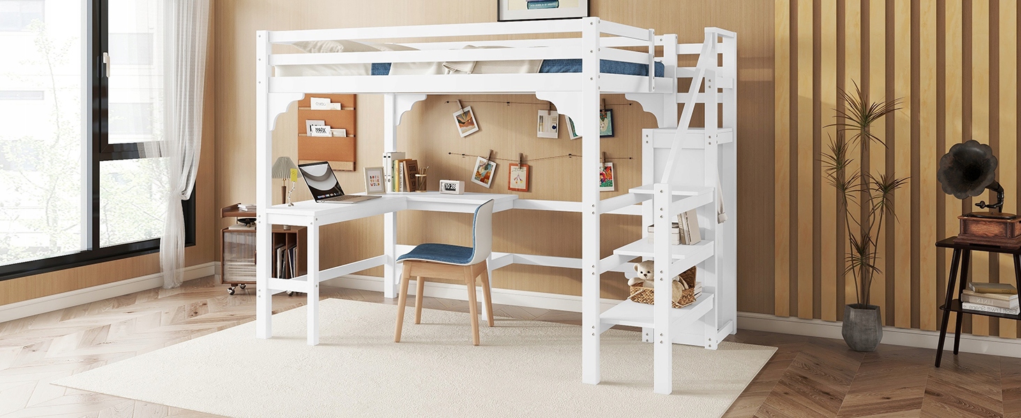 Функціональність: наше двоярусне ліжко оснащене письмовим столом Г-подібної форми та відкритою шафою, що забезпечує зручність роботи чи навчання. У місці біля столу можна розмістити невеликий диван, шафу тощо, а сходи з місцем для зберігання спрощують організацію.