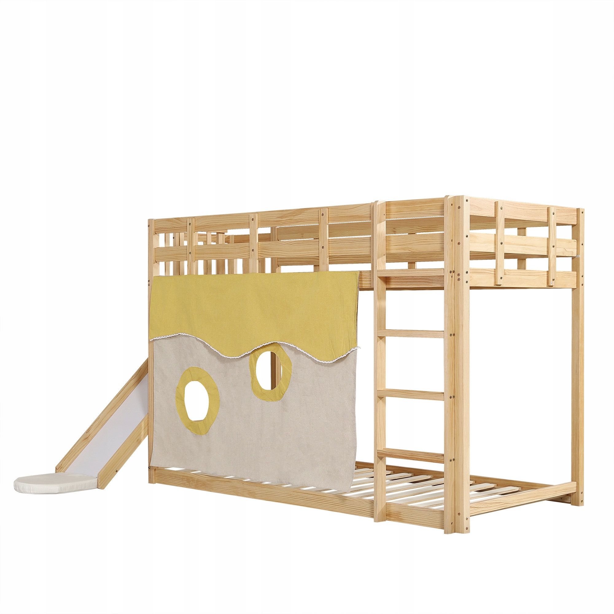 Ми представляємо наше нове дитяче двоярусне ліжко - фантастичний предмет меблів, який ідеально поєднує в собі практичність і веселощі в кожній дитячій кімнаті! Це практичне двоярусне ліжко не тільки заощаджує дорогоцінний простір, але й забезпечує додатковий простір для ігор або зберігання під верхнім ярусом. Міцна конструкція ліжка забезпечує тривалу стабільність, тож ваша дитина може безпечно та комфортно спати та грати. У чому його головна привабливість? Весела гірка, яка перетворює підйом і підйом з ліжка захоплюючим досвідом - щоразу це буде як маленька пригода! Ліжко постачається з красивими шторами, які надають ліжку приємного, затишного вигляду, створюючи приватний, зручний куточок для вашої дитини. Незалежно від того, сучасна, весела чи мінімалістична кімната вашої дитини, це двоярусне ліжко ідеально впишеться в різноманітні дизайни дитячої та гармонійно впишеться в будь-яку обстановку!