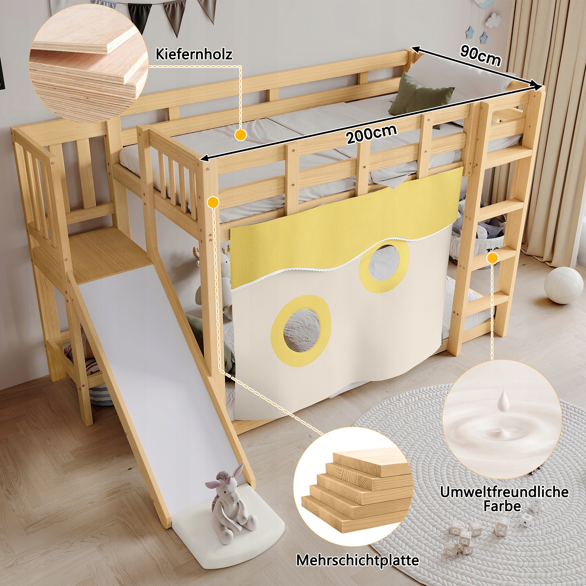 Функціональний дизайн: двоярусне ліжко (90x200 см) зі стійкими сходами, поручнями, поручнями безпеки та решітками поєднує в собі практичність і безпеку, оптимально використовуючи простір дитячої кімнати.