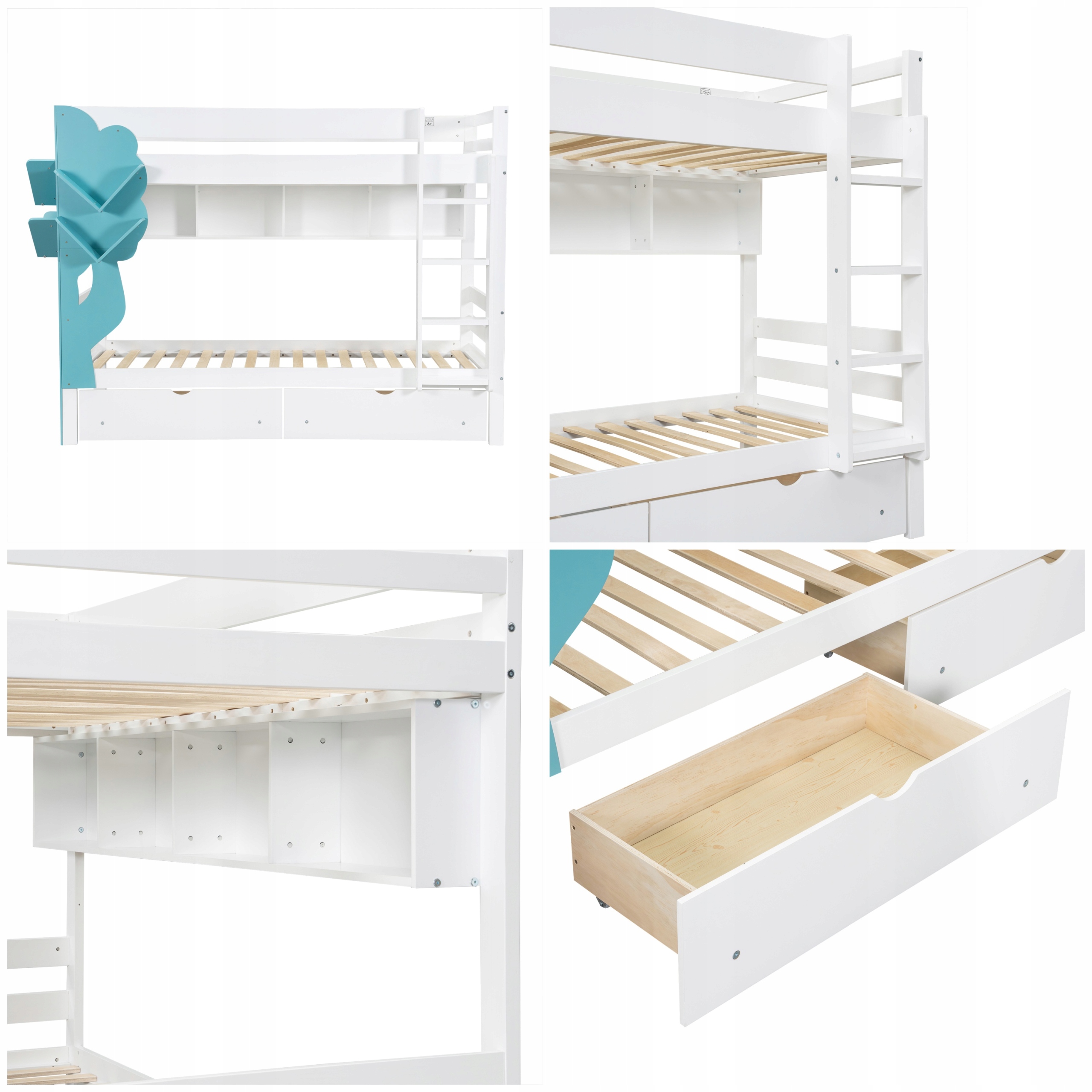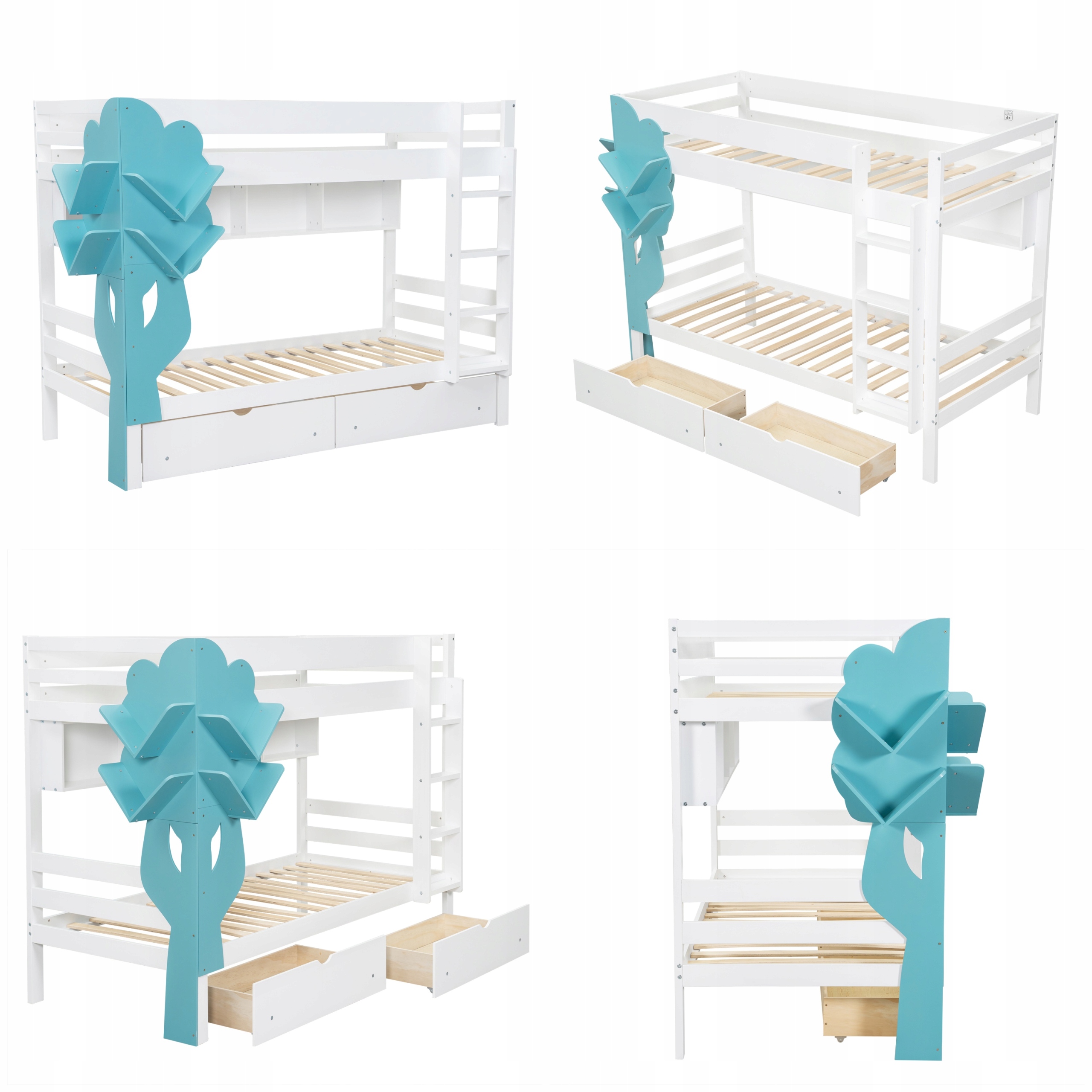 Двох’ярусне ліжко, креативне дитяче ліжко, книжкова шафа у формі дерева, відкрита полиця, дві шухляди з коліщатками, з безпечними воротами, багато місця для зберігання, сосна + МДФ, білий + синій, 90 x 200 см
