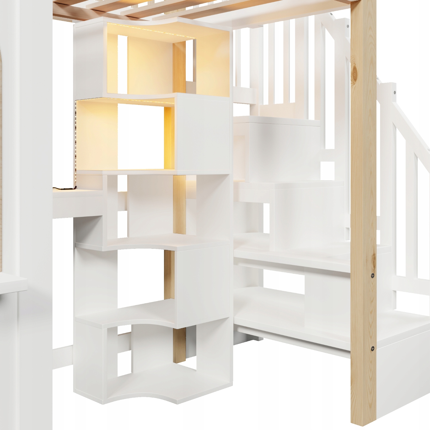 Ліжко двоярусне 90х200 см (білий + натуральний) зі світлодіодним підсвічуванням і віконною формою. У комплекті: драбина з місцем для зберігання, відкритий простір для зберігання, письмовий стіл, розетка. Матрац не входить.