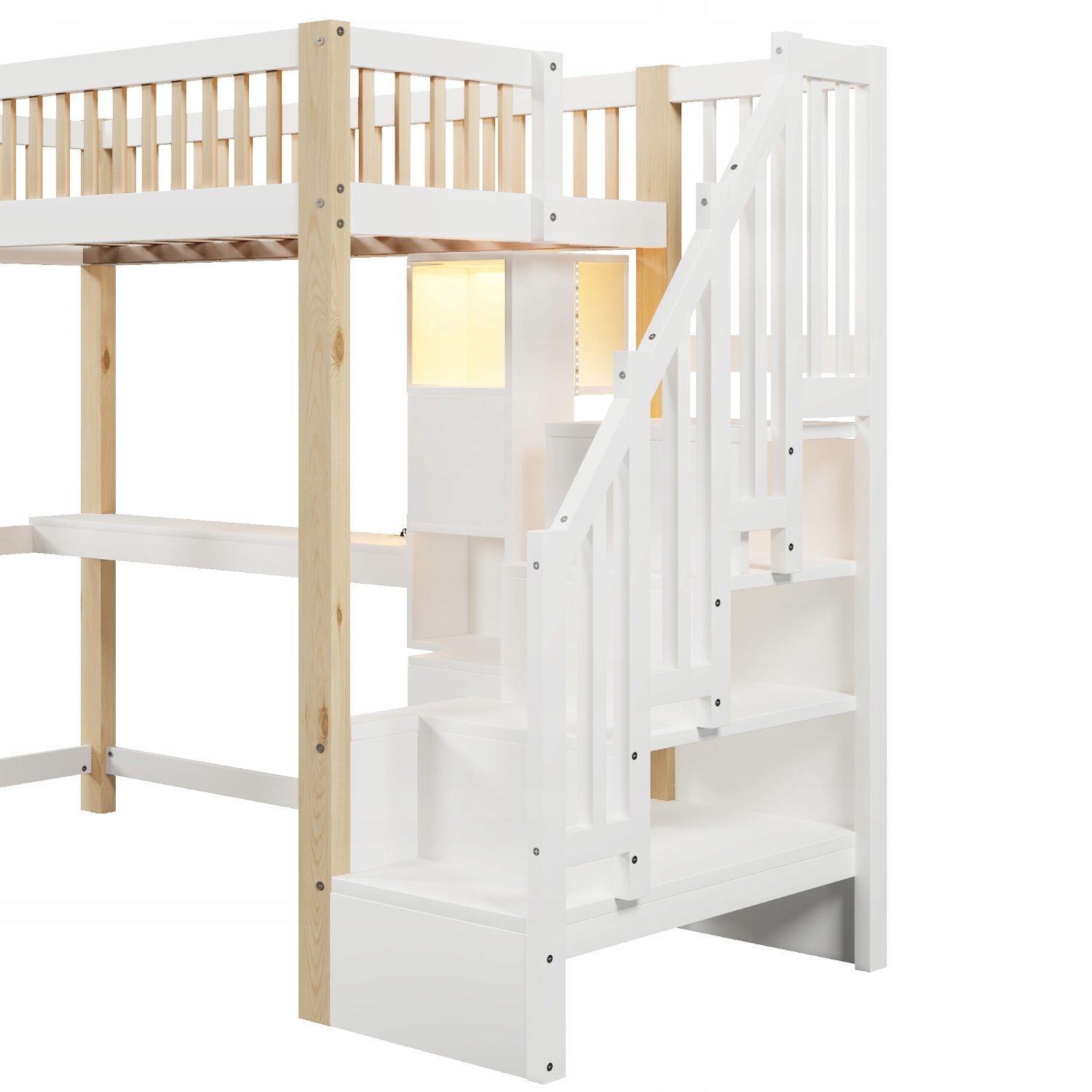 Ліжко двоярусне 90х200 см біле та натуральне, LED, драбина з ящиком, письмовий стіл