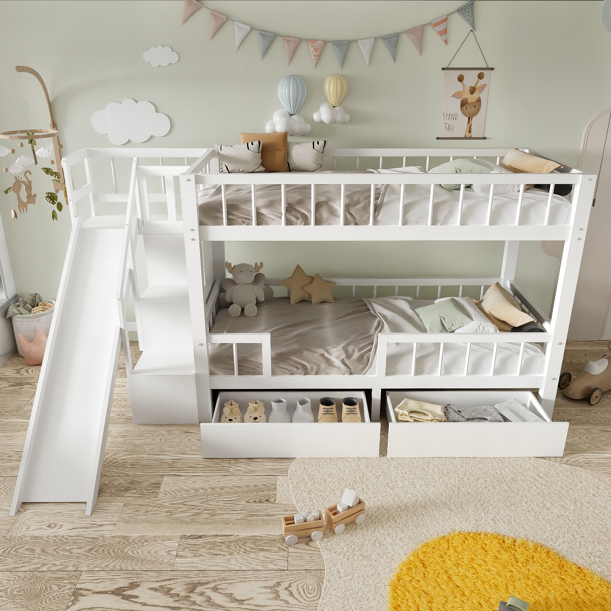 ЕКОНОМІЯ ПРОСТОРУ: оснащений 2 висувними ящиками під ліжком, він ефективно використовує простір і забезпечує додатковий простір для зберігання дитячих іграшок, книг та одягу, підтримуючи кімнату чистою та охайною.