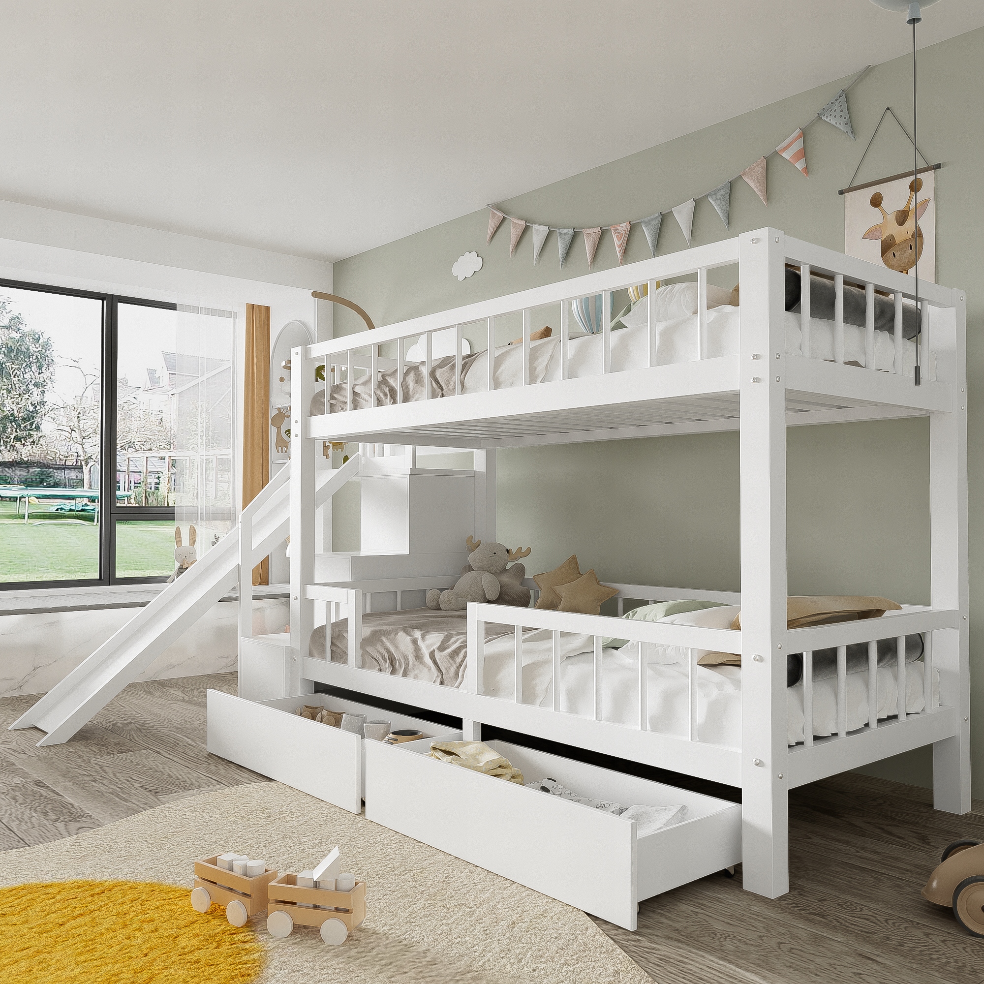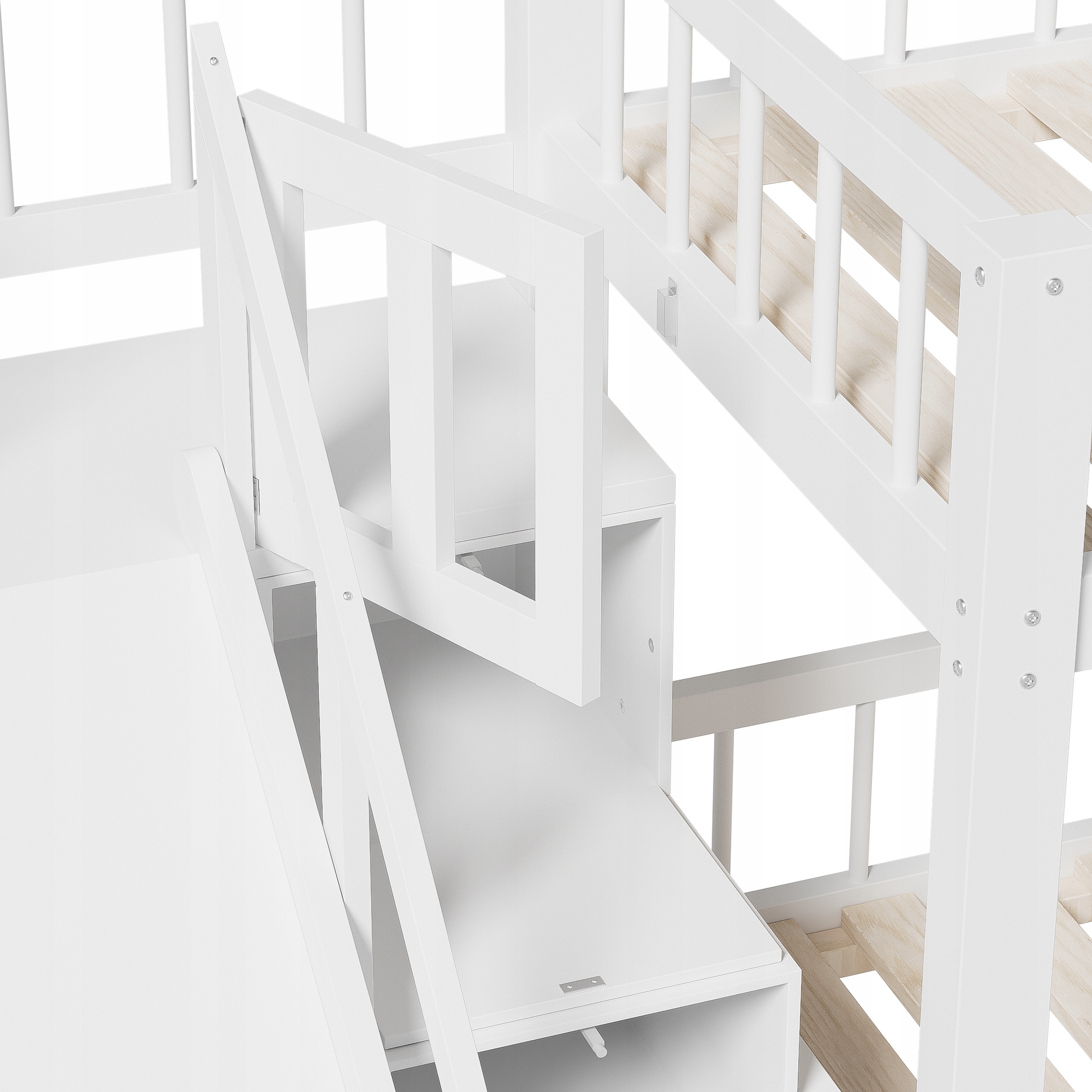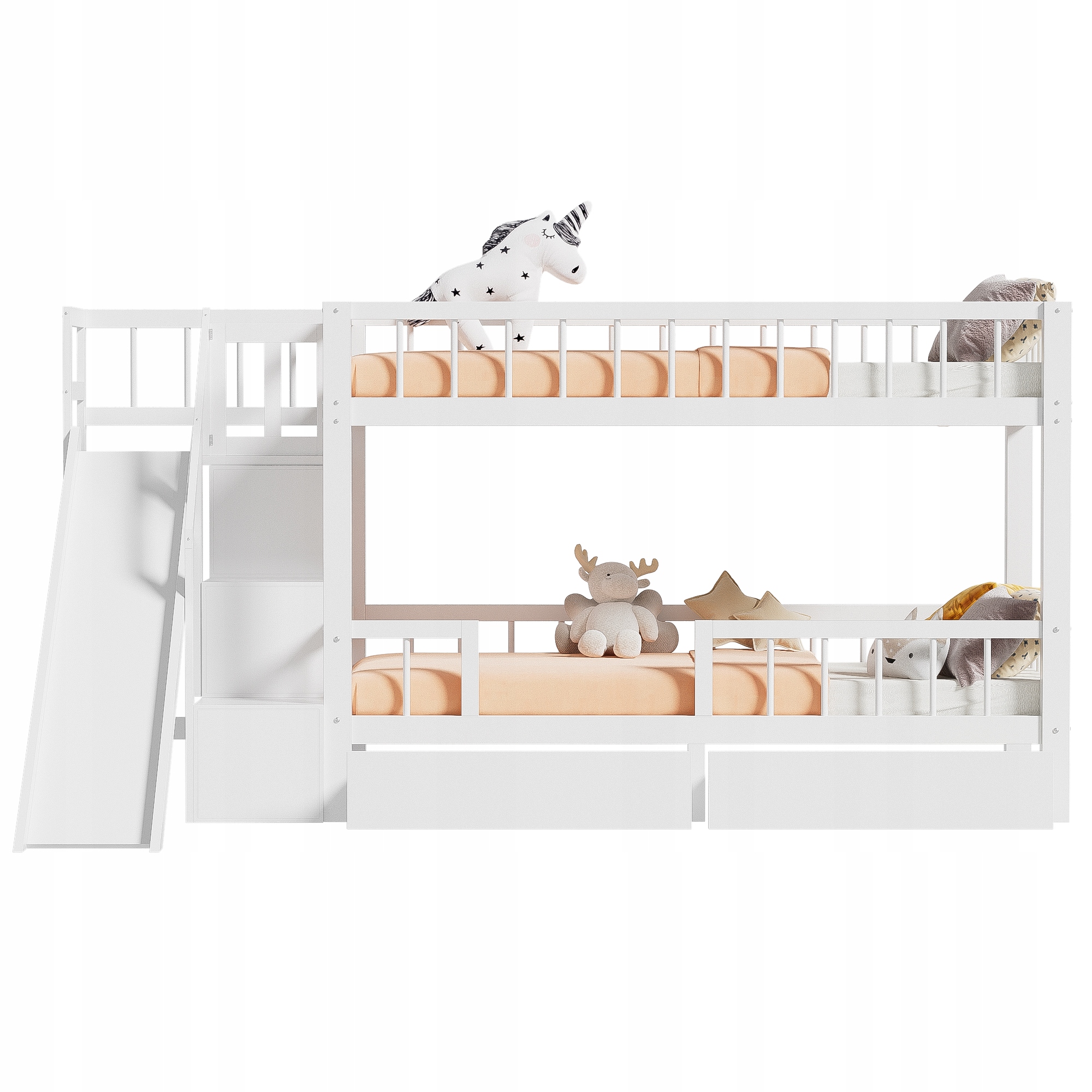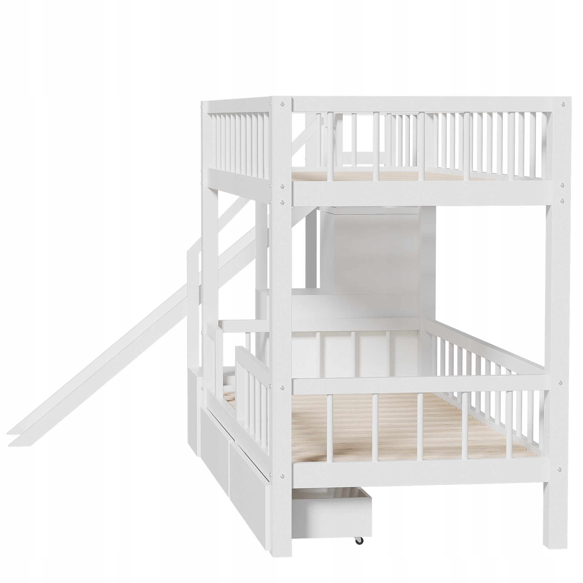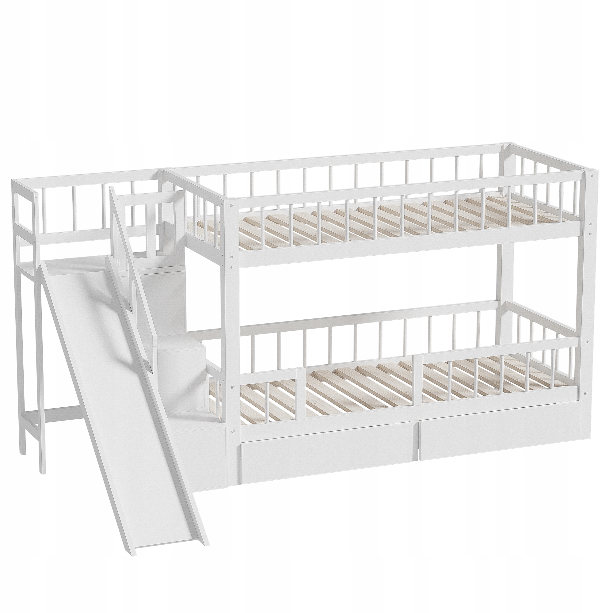 Ліжко дитяче двоярусне, ліжко багатофункціональне дитяче, з гіркою та сходами, з 2 ящиками, з магнітними дверцятами, без матраца, масив дерева, білий, 90*200
