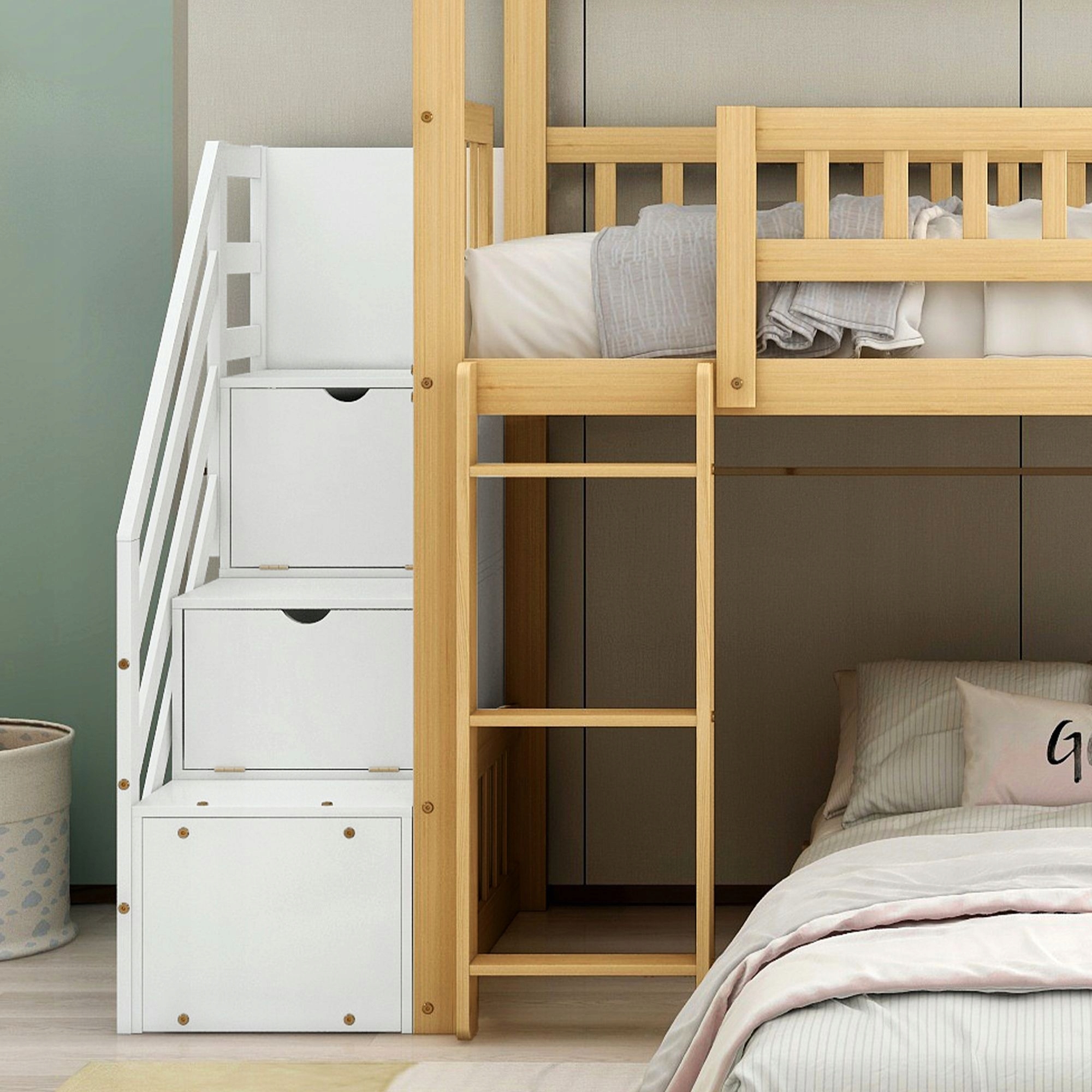 Двоярусне ліжко зі сходами з поручнями та кутовою драбиною, сходи з місцем для зберігання, ліжко-будинок з гіркою, дитяче ліжко з захистом від падіння та сіткою, дерев’яний каркас, колір натуральний + білий (90x200 см)