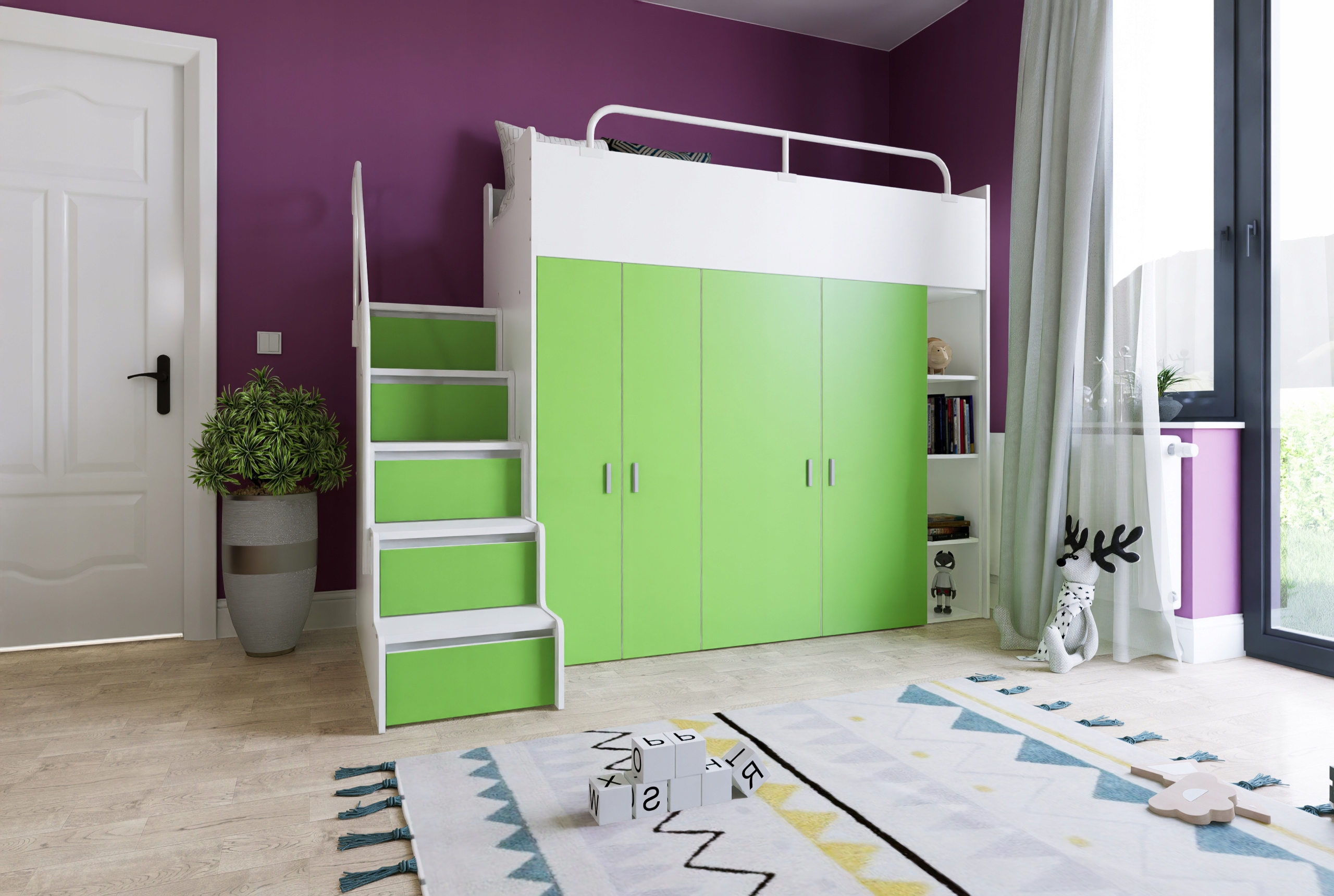 Двоярусне ліжко KIKI 2 - це функціональне та практичне рішення для дитячої та підліткової кімнати. Оснащений зручними сходинками, він забезпечує легкий доступ до верхнього ліжка, що робить його безпечним для користувачів. Крім того, KIKI 2 має дві вбудовані шафи з обох сторін, що забезпечує достатньо місця для зберігання одягу, книг та інших речей. Це ідеальне рішення для тих, хто шукає практичний предмет меблів, який поєднує в собі функціональність, економію місця та естетичний дизайн.