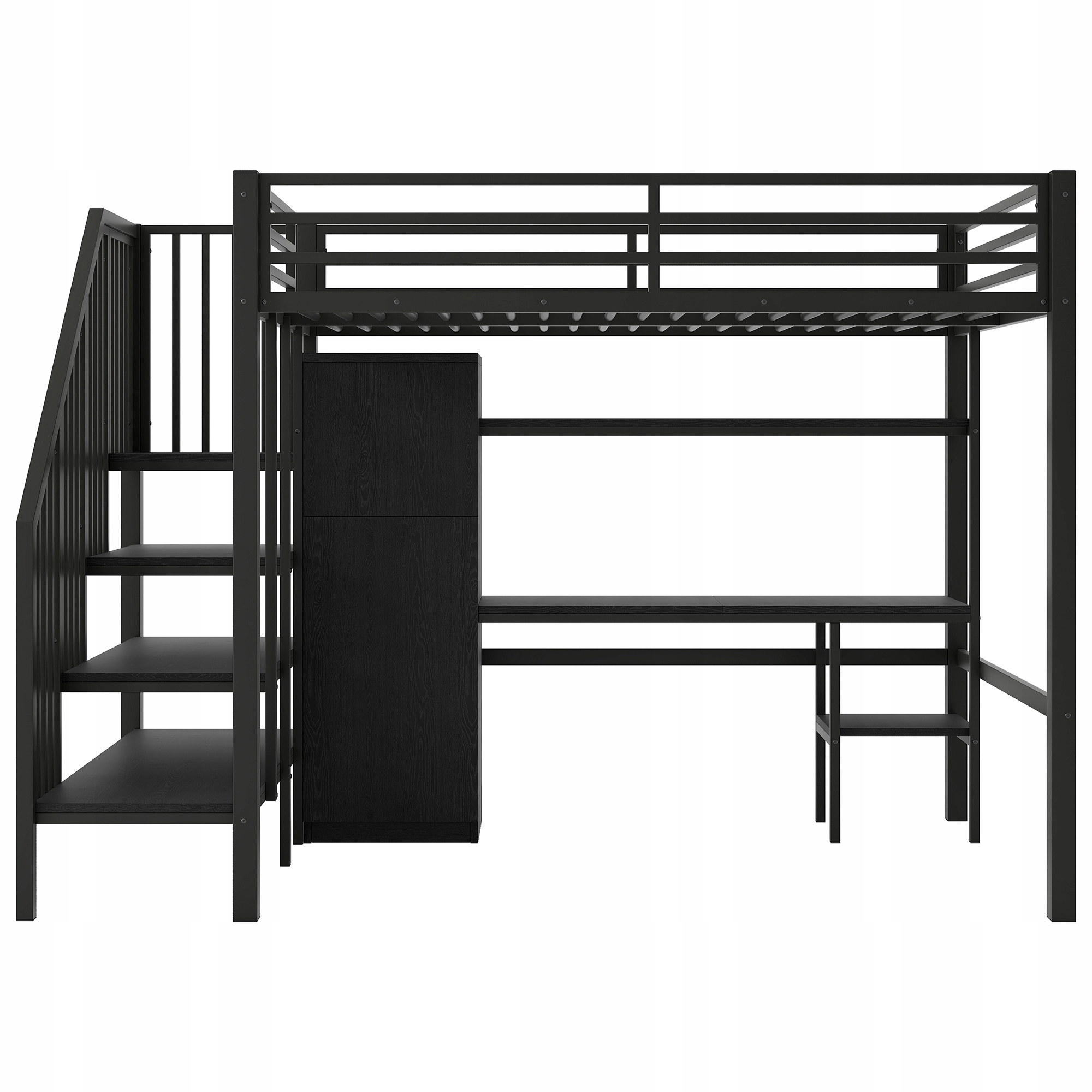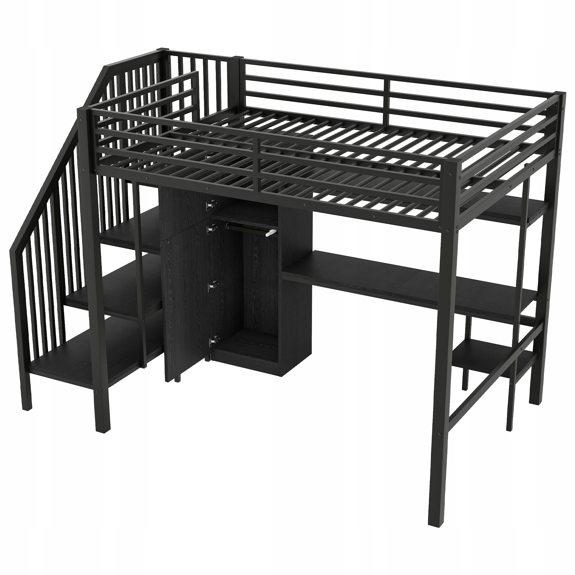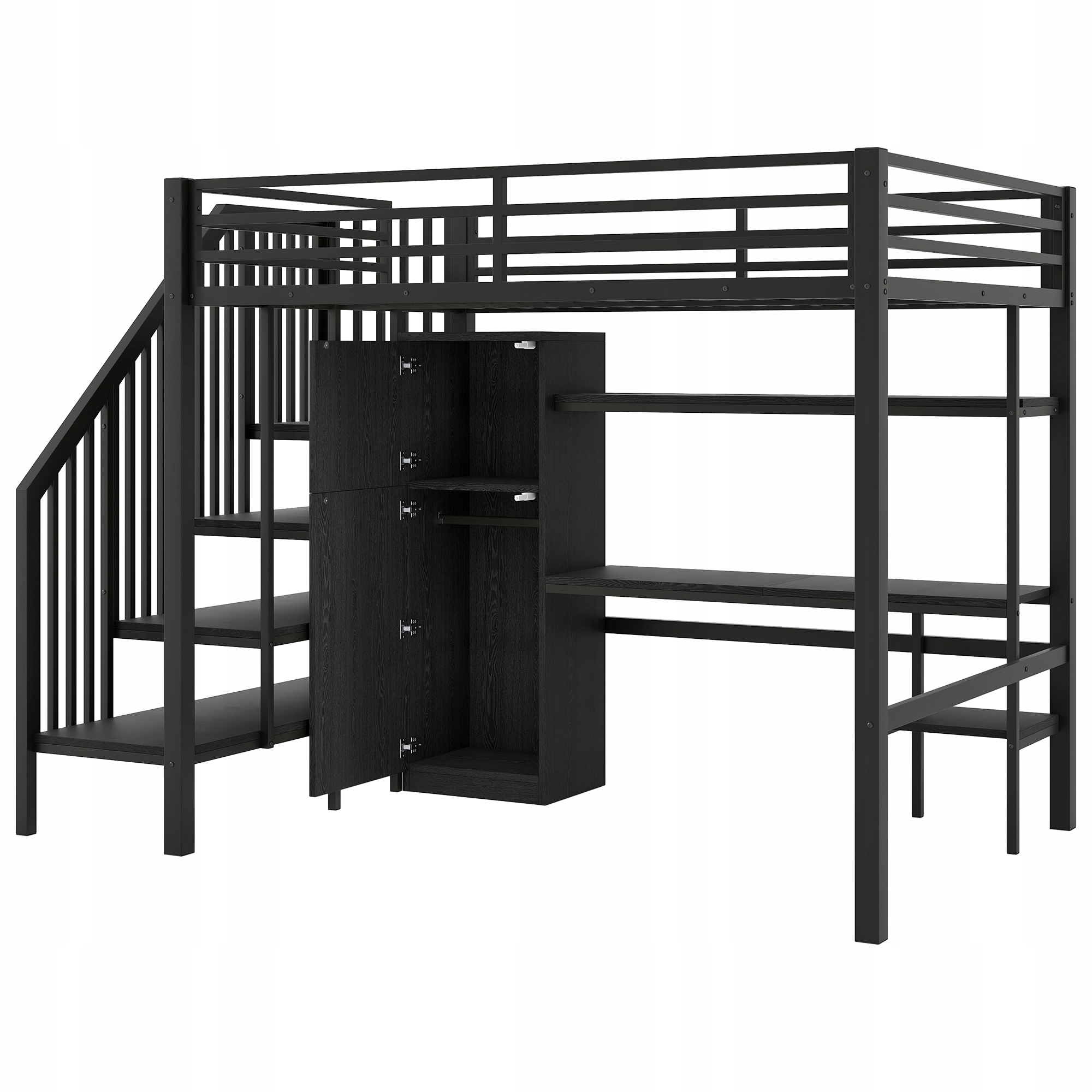 Ліжко двоярусне металеве 140x200 зі столом, полицею, шафою та сходинками для речей, чорний